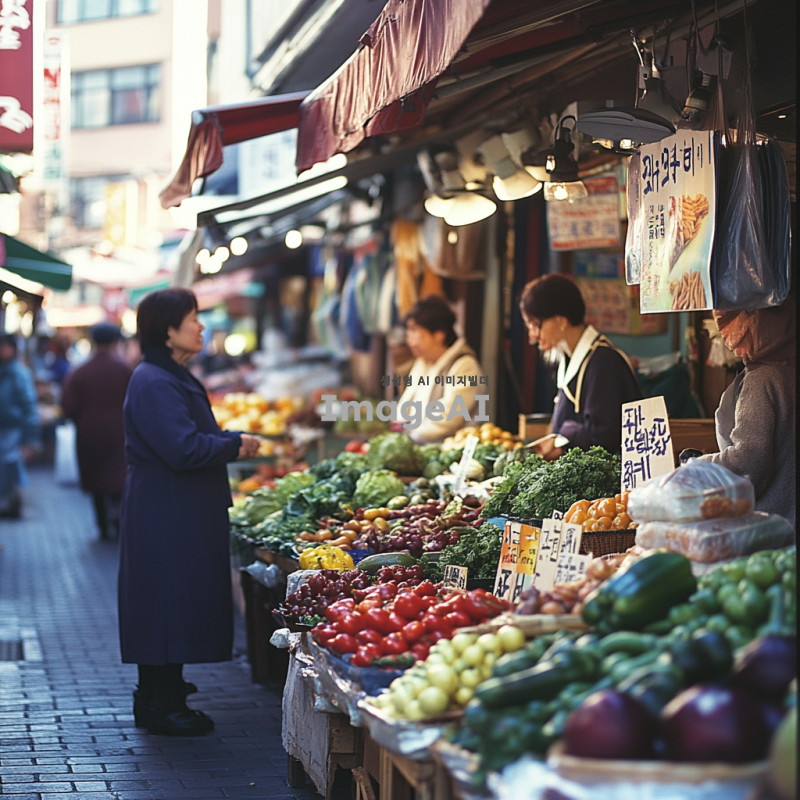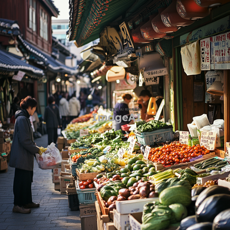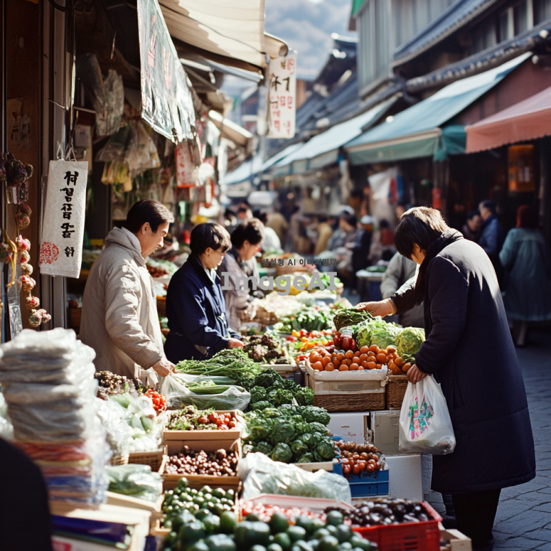 한국의 전통 시장에서 활기차게 장을 보는 사람들, 다양한 신선한 채소와 과일이 진열된 상점들, 상인과 고객 간의 따뜻한 소통, 햇살이 비치는 시장 풍경, 생동감 넘치는 색감과 분위기, 한국 전통 의상을 입은 사람들, 문화적 요소가 잘 드러나는 장면.
