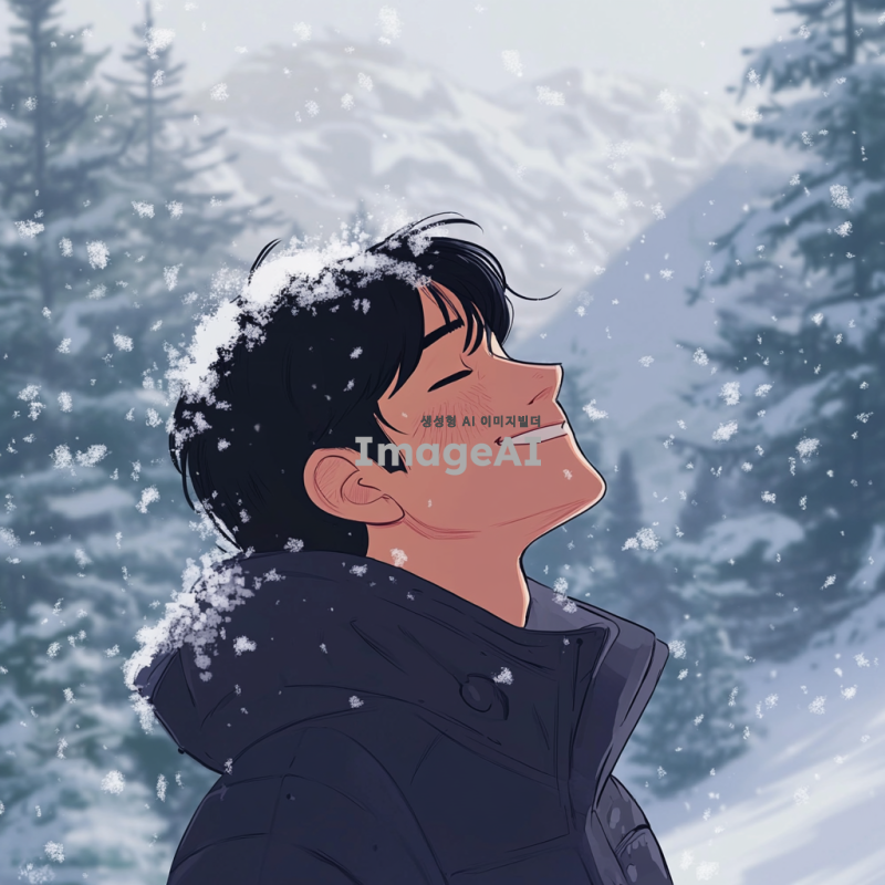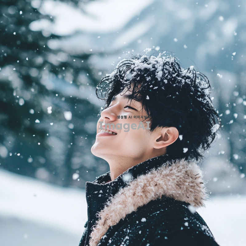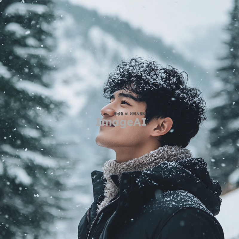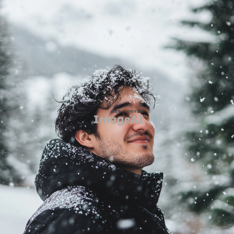 겨울 풍경 속에서 눈을 맞고 있는 흑발 성인 남자의 모습. 부드러운 눈송이가 그의 머리와 어깨에 내려앉고, 따뜻한 겨울 코트를 입고 있다. 배경에는 하얀 눈으로 덮인 나무와 산이 보이며, 차가운 공기 속에서 그의 얼굴에는 행복한 미소가 번지고 있다. 자연의 아름다움과 겨울의 정취가 함께 어우러진 장면.