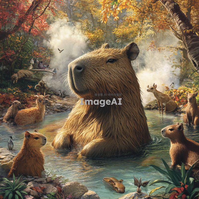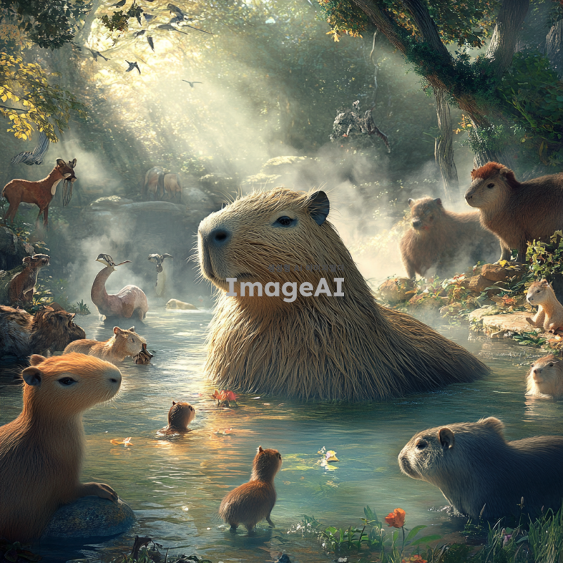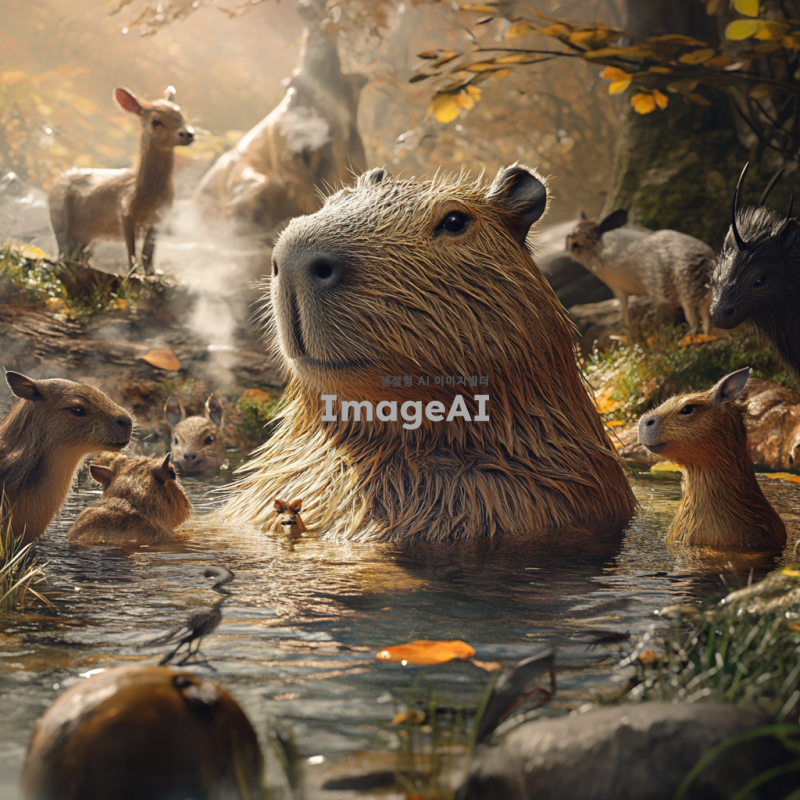 온천에 담가진 암컷 카피바라가 다양한 동물들과 함께 있는 모습, 주변에는 따뜻한 증기가 피어오르고, 카피바라와 동물들이 서로 친근하게 교감하는 장면, 자연의 아름다움이 배경으로 펼쳐진 따뜻하고 아늑한 분위기.