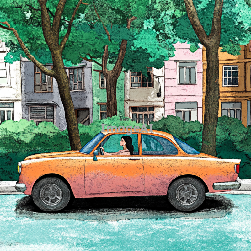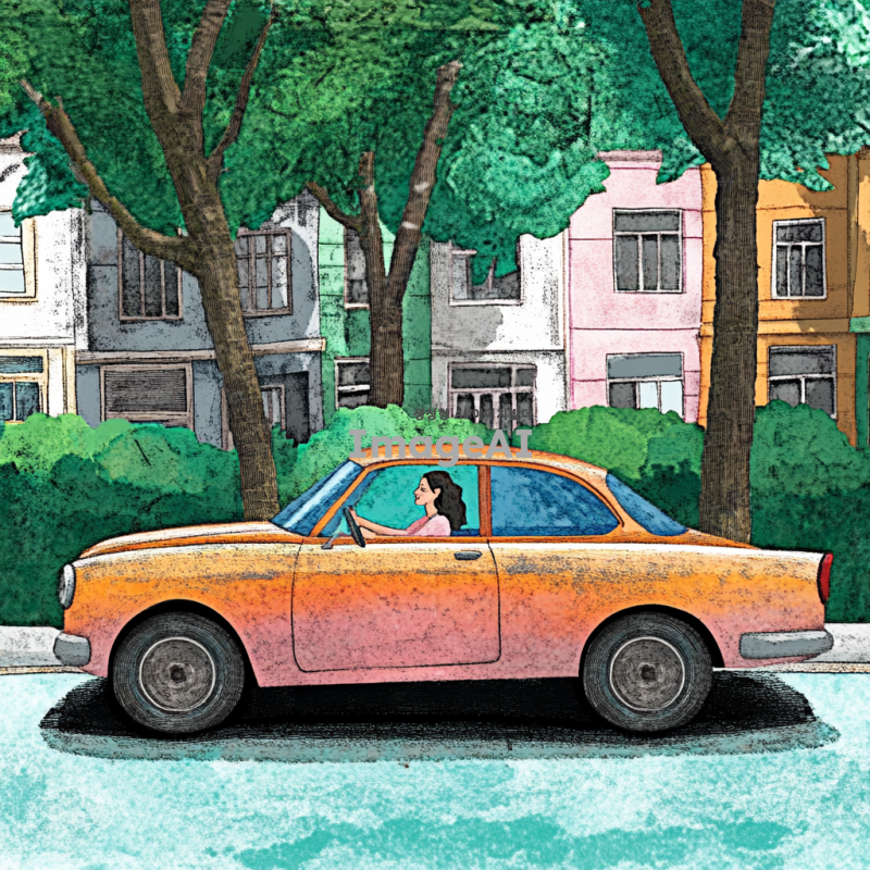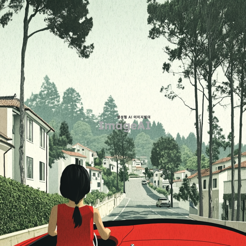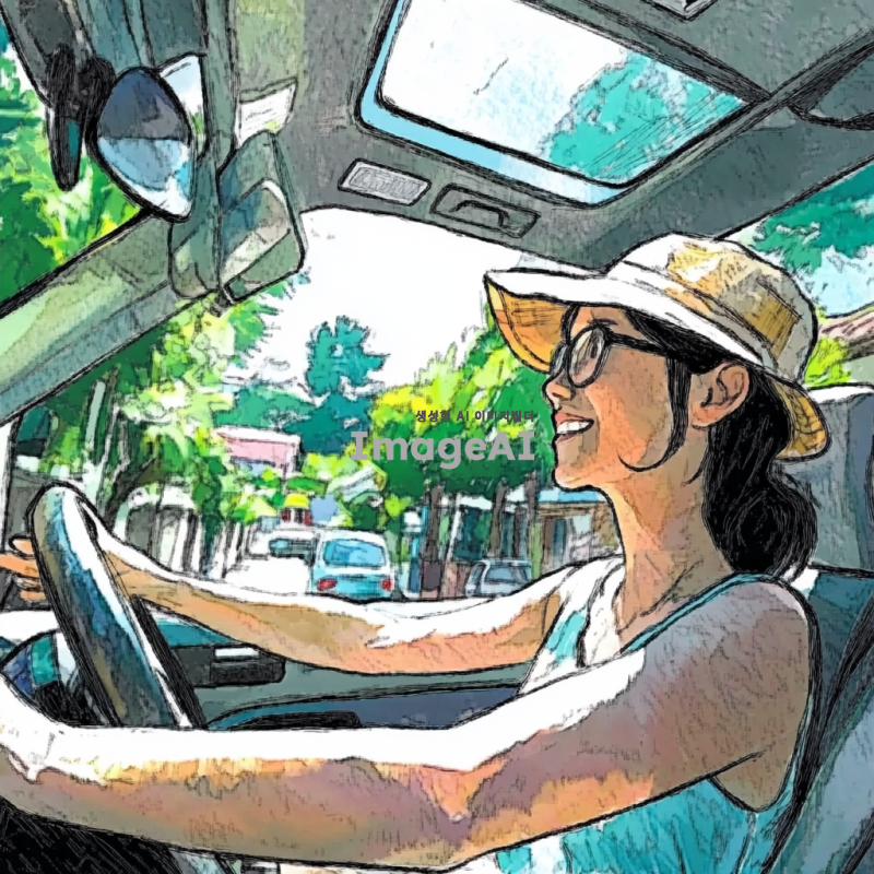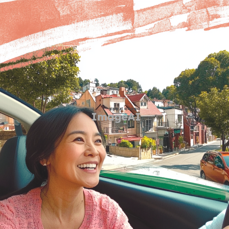 한국의 한 주택가에서 엄마가 차를 운전하고 있는 모습. 차는 현대적인 디자인의 세단으로, 밝은 색상으로 칠해져 있으며, 창문을 열고 바람을 맞고 있는 모습. 배경에는 푸른 나무와 아늑한 집들이 보이고, 따뜻한 햇살이 비추고 있는 분위기. 엄마는 미소를 지으며 행복한 표정을 짓고 있다.
