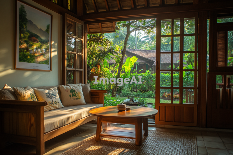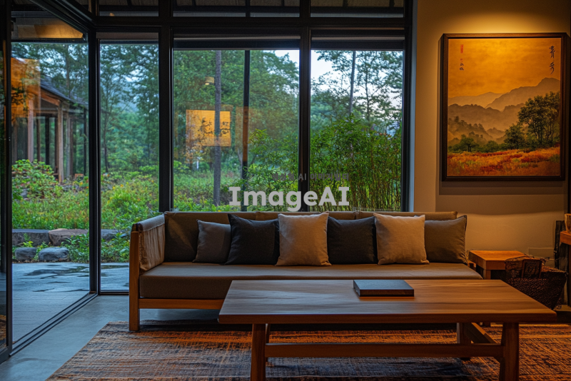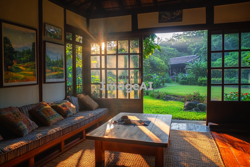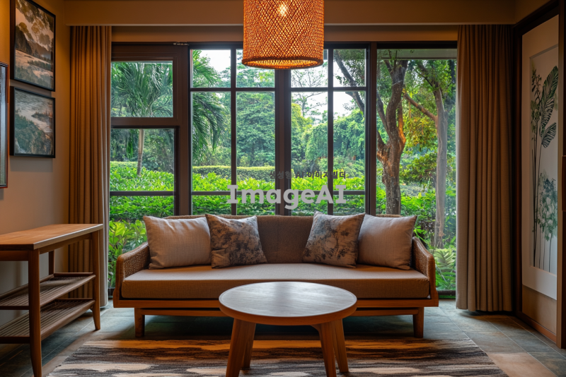 새벽의 조용한 리조트 내부, 부드러운 자연광이 창문을 통해 들어오고, 아늑한 소파와 나무로 된 테이블이 배치되어 있는 공간. 벽에는 아름다운 풍경화가 걸려 있고, 바닥에는 따뜻한 느낌의 카펫이 깔려 있다. 창 밖으로는 이슬 맺힌 정원과 푸른 나무들이 보인다. 편안하고 평화로운 분위기를 강조한 장면.