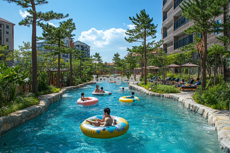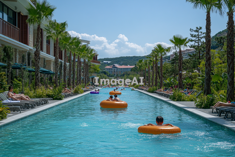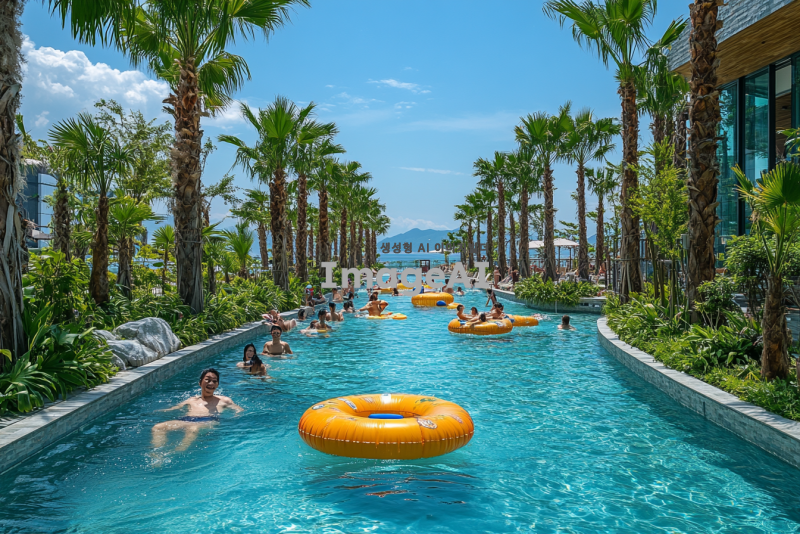 한국의 리조트 수영장에서 여유롭게 휴식하는 사람들, 푸른 하늘과 햇살이 가득한 날씨, 수영장 주변에 열대 식물과 야자수가 어우러진 풍경, 수영장에 떠 있는 튜브와 물놀이를 즐기는 아이들, 수영장 옆에는 시원한 음료를 즐기는 사람들이 있는 모습.