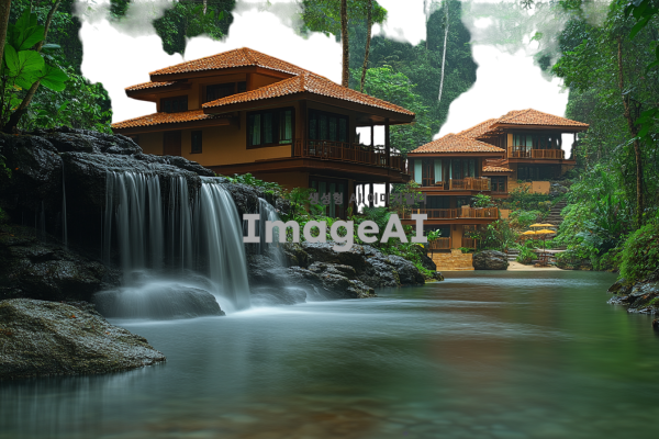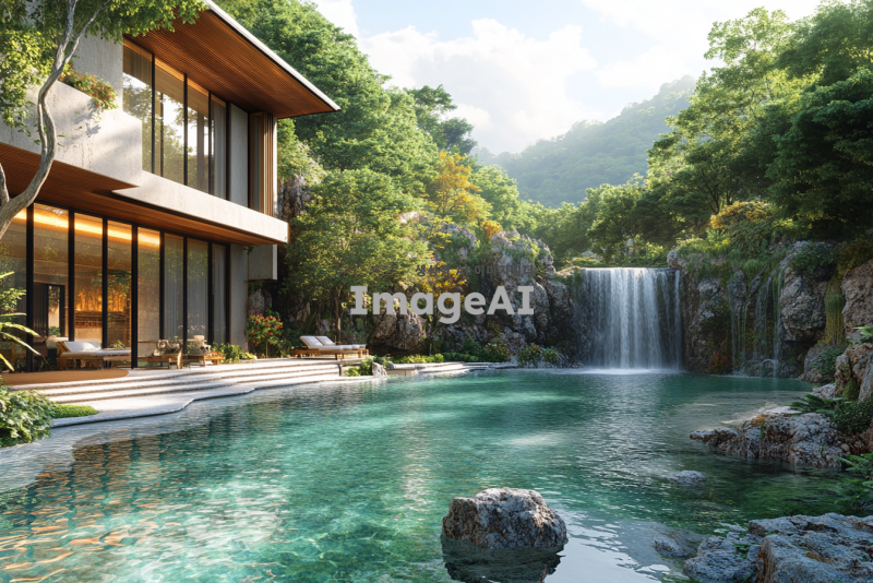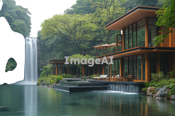 울창한 숲과 절벽 사이로 흐르는 폭포가 있는 리조트 전경, 푸른 나무와 맑은 물이 어우러진 자연 풍경, 고요하고 평화로운 분위기, 리조트 건물은 현대적이고 세련된 디자인으로, 자연과 조화를 이루며 배치됨, 햇살이 비치는 따뜻한 날씨, 새들이 노래하는 소리와 함께하는 자연의 아름다움