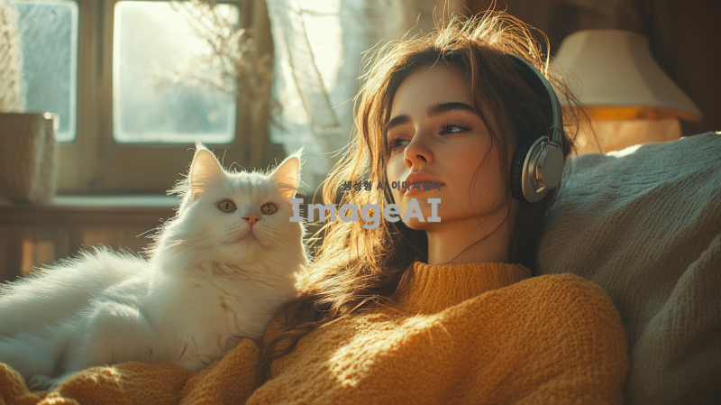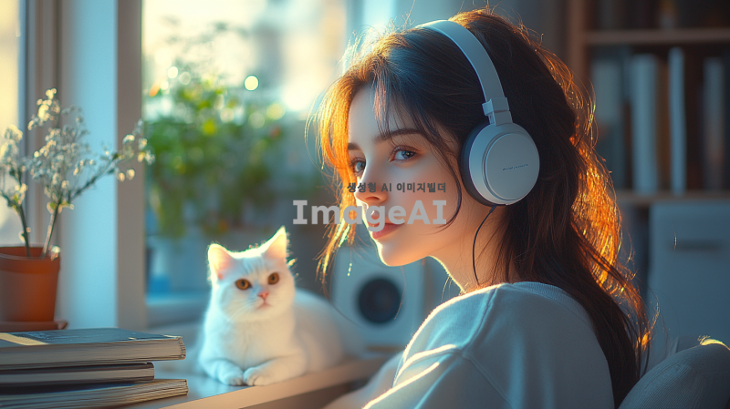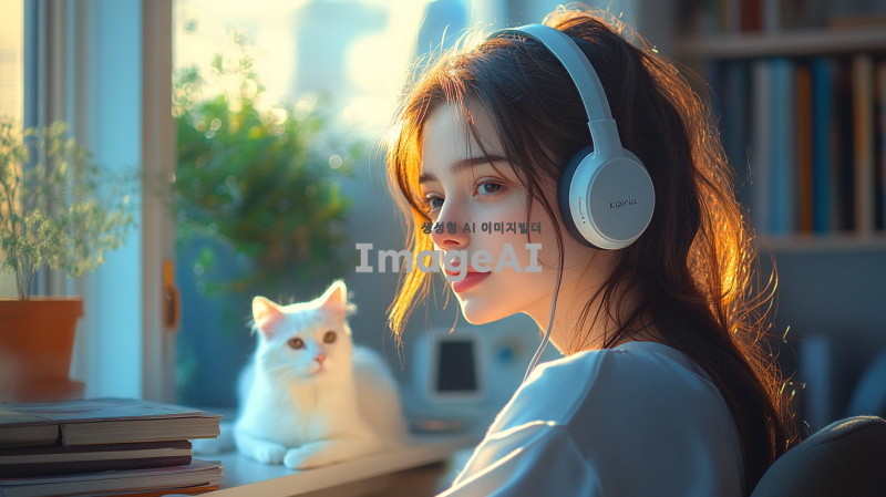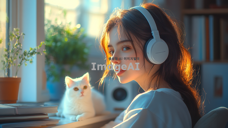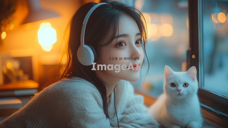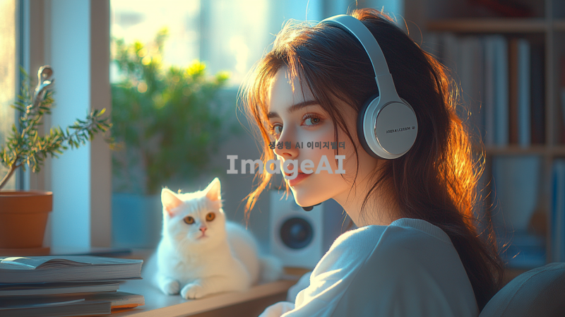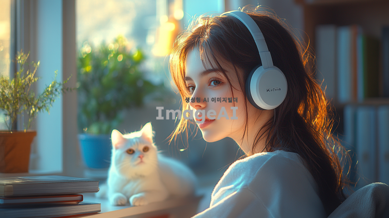 "헤드셋을 쓴 아름다운 여성이 카리나를 닮은 얼굴로, 청순하면서도 우아하고 세련된 분위기를 풍깁니다. 그녀는 따뜻한 조명과 새벽의 고요한 분위기가 느껴지는 아늑한 방에 앉아 있습니다. 방은 책, 램프, 그리고 희미한 새벽빛이 들어오는 창문과 같은 섬세한 장식 요소들로 부드럽게 꾸며져 있습니다. 그녀 옆에는 귀여운 흰 고양이가 탁자나 의자 위에 앉아 있어 장면에 매력을 더합니다. 전체적인 장면은 조화롭고 평화로운 분위기를 담고 있습니다."