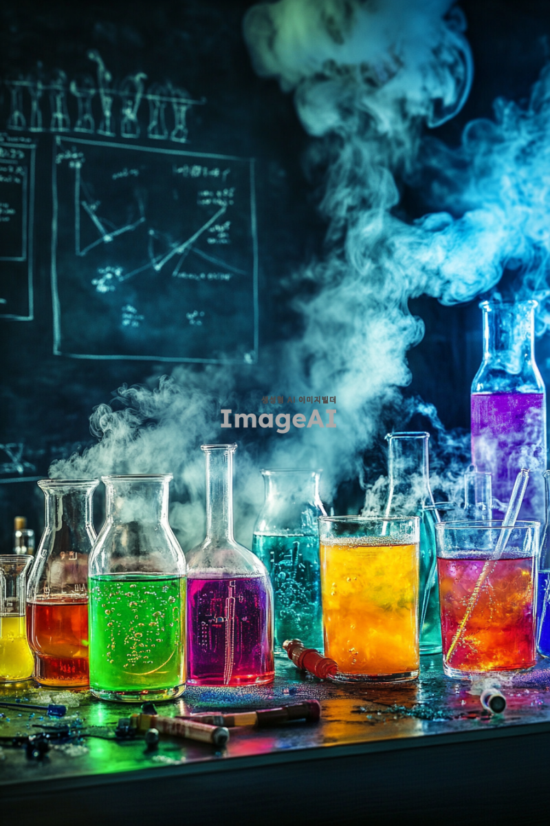 과학실 컨셉의 칵테일 바 홍보 포스터, 실험 도구와 화학 약품이 배열된 테이블 위에 다양한 칵테일이 담긴 플라스크와 비커가 놓여있고, 화려한 색상의 음료가 거품을 내며 발산하는 증기, 배경에는 화학 공식과 그래프가 그려진 칠판, 조명은 실험실의 차가운 느낌을 주는 푸른색과 초록색으로 조절, 분위기는 신비롭고 흥미로운 느낌, 한국인 바텐더가 실험복을 입고 칵테일을 만드는 모습.