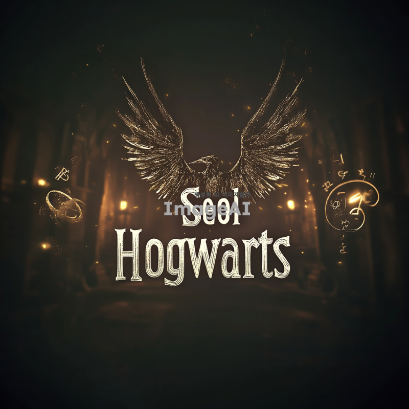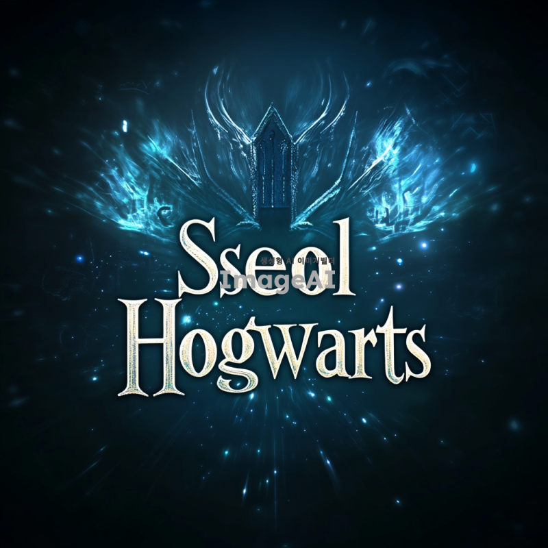 "썰호그와트"라는 글씨가 크게 중앙에 위치하고, 배경은 마법과 판타지의 느낌을 주는 어두운 색조로 설정된 이미지. 글씨는 신비로운 느낌의 폰트로, 빛나는 효과가 추가되어 주변이 어둡더라도 글씨가 잘 보이도록 강조됨. 배경에는 흐릿한 마법의 상징이나 해리포터 세계관을 연상시키는 요소들이 subtly하게 배치되어 있음.