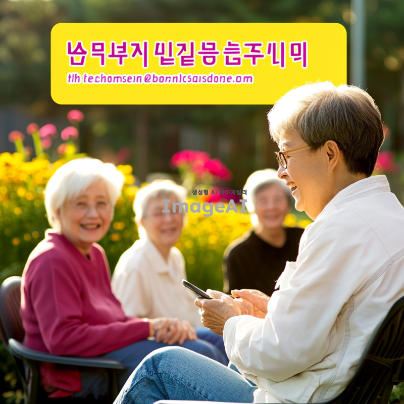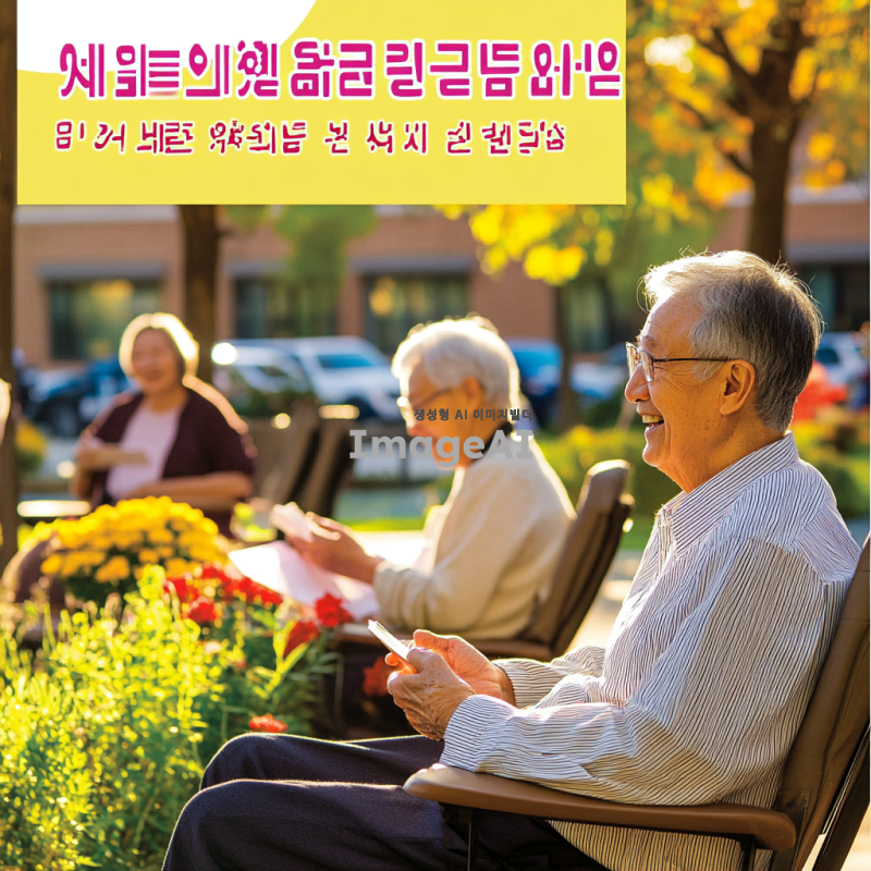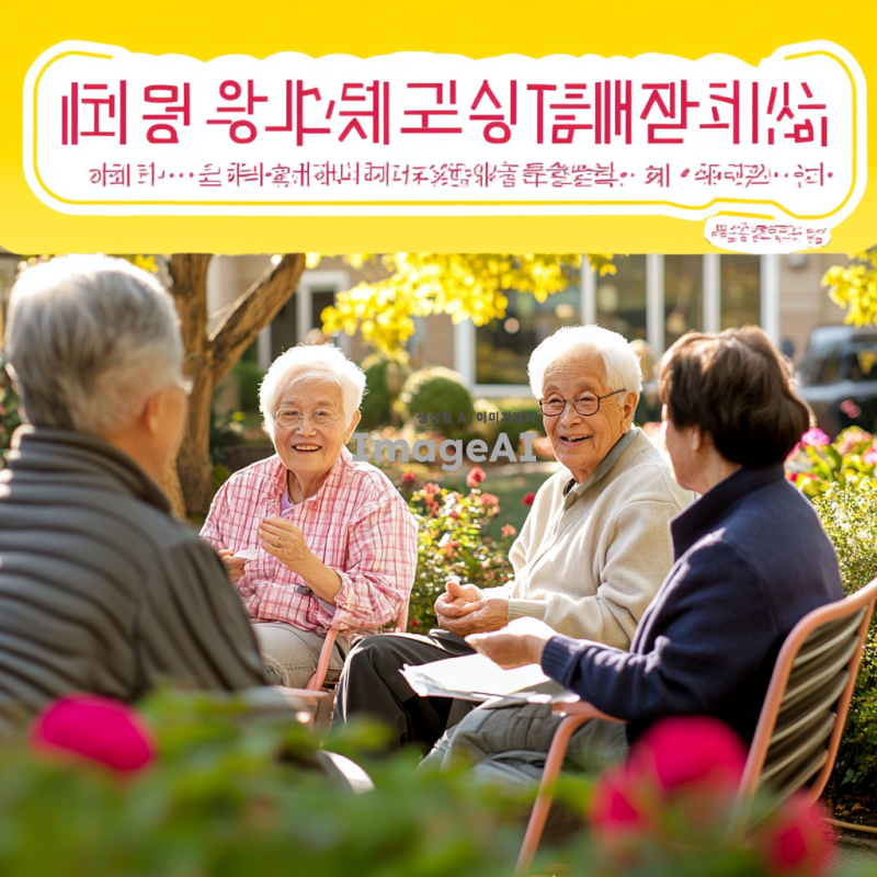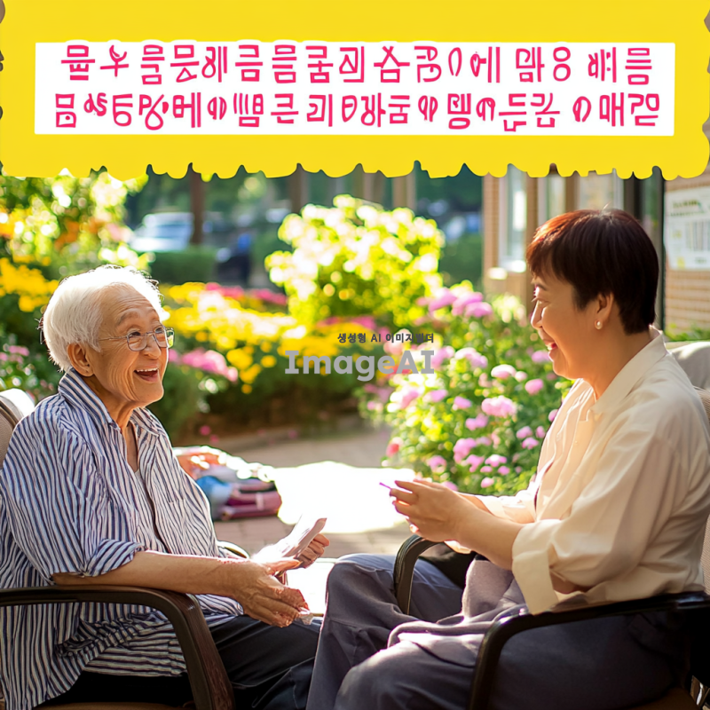 따뜻한 햇살 아래에서 편안하게 앉아있는 노인들이 서로 대화하며 웃고 있는 모습, 주변에는 아름다운 꽃과 나무들이 가득한 정원, 친절한 직원이 노인들과 함께 활동을 즐기는 장면, 아늑하고 따뜻한 분위기의 노인 재가센터 내부, 다양한 프로그램이 진행되고 있는 모습, 사랑과 배려가 넘치는 공간의 느낌을 담아낸 이미지.