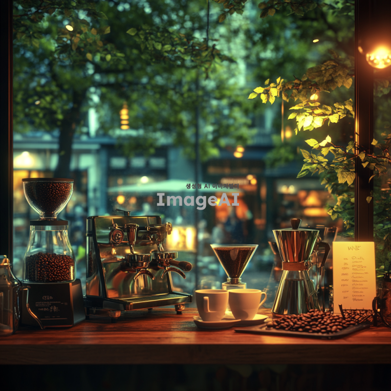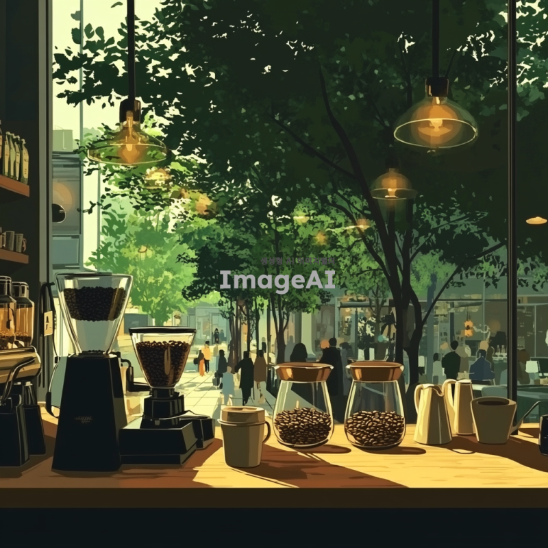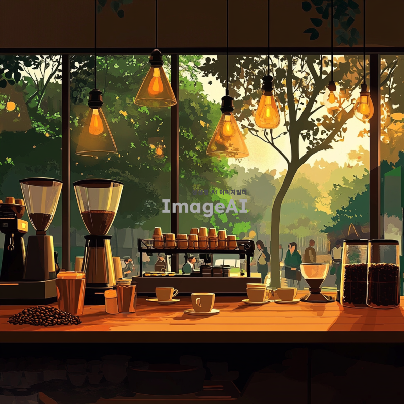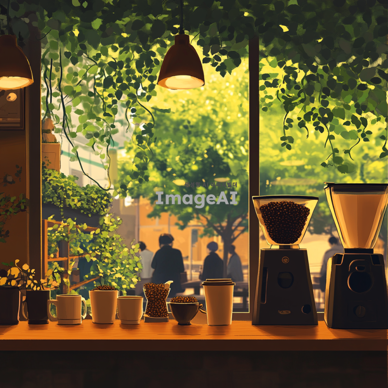 아늑한 카페의 내부, 따뜻한 조명이 비추는 나무 테이블 위에 놓인 다양한 커피잔과 커피 원두, 커피 머신이 있는 풍경. 창밖으로 보이는 푸른 나무와 사람들의 모습이 어우러진 일상적인 풍경, 부드러운 음악이 흐르는 분위기를 담아낸 장면.
