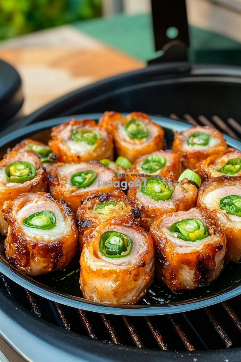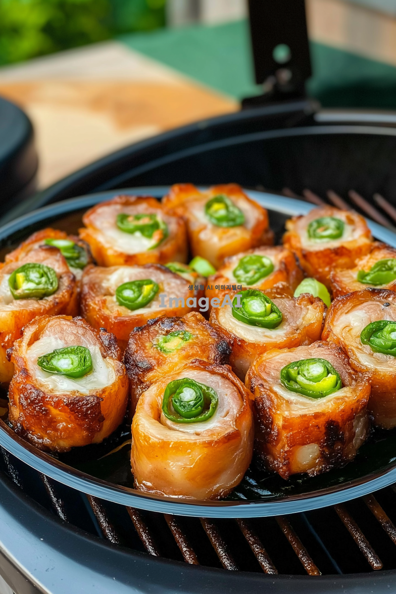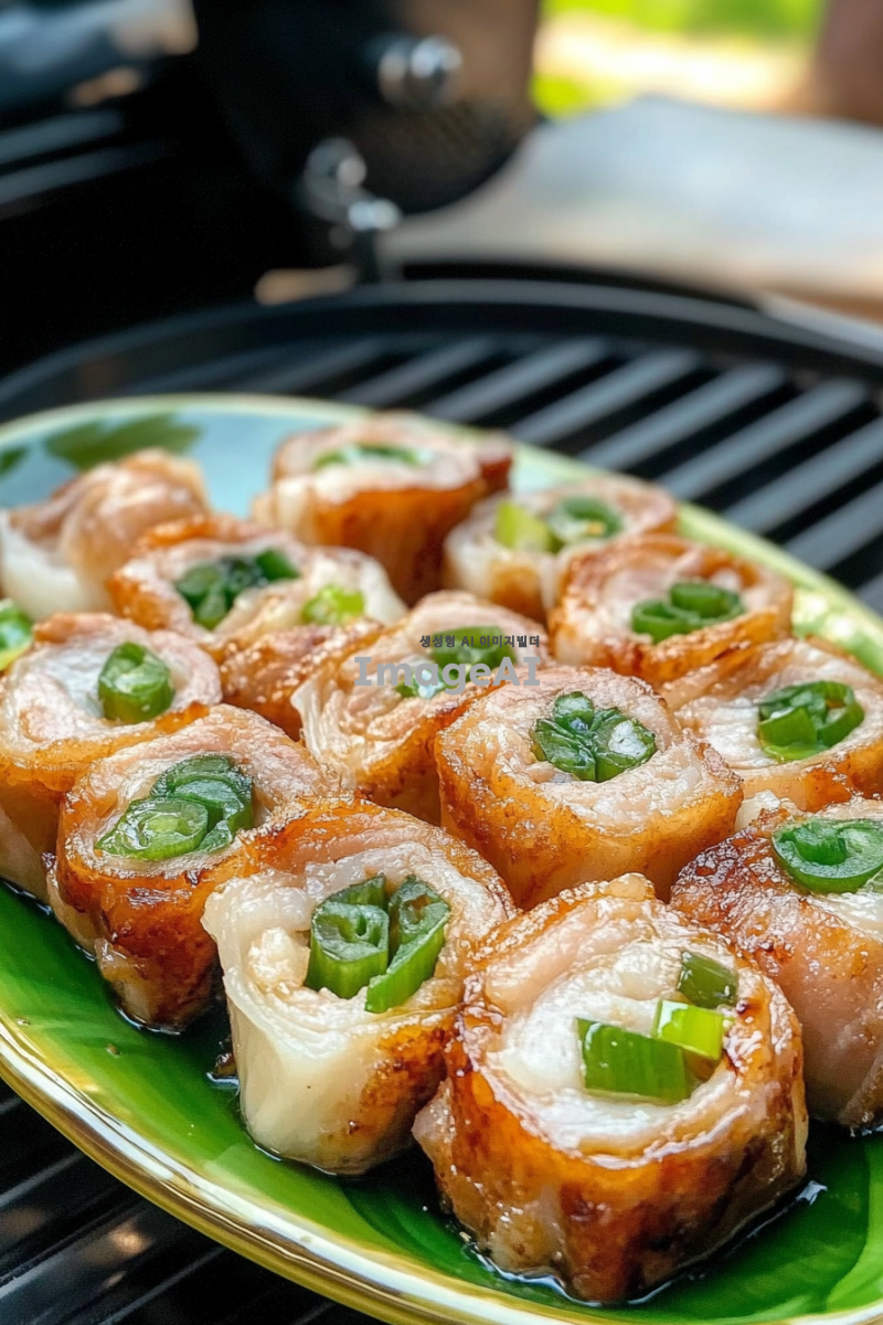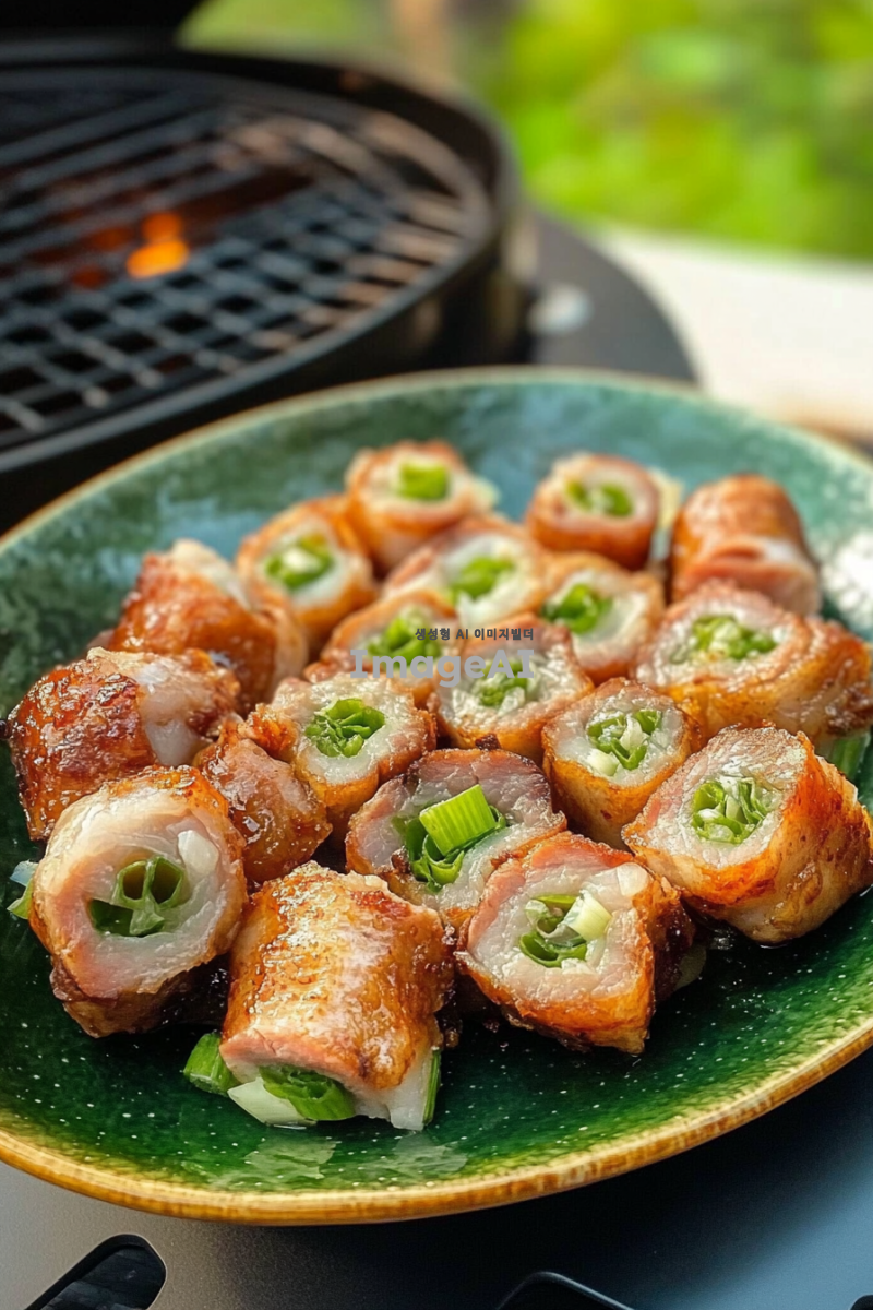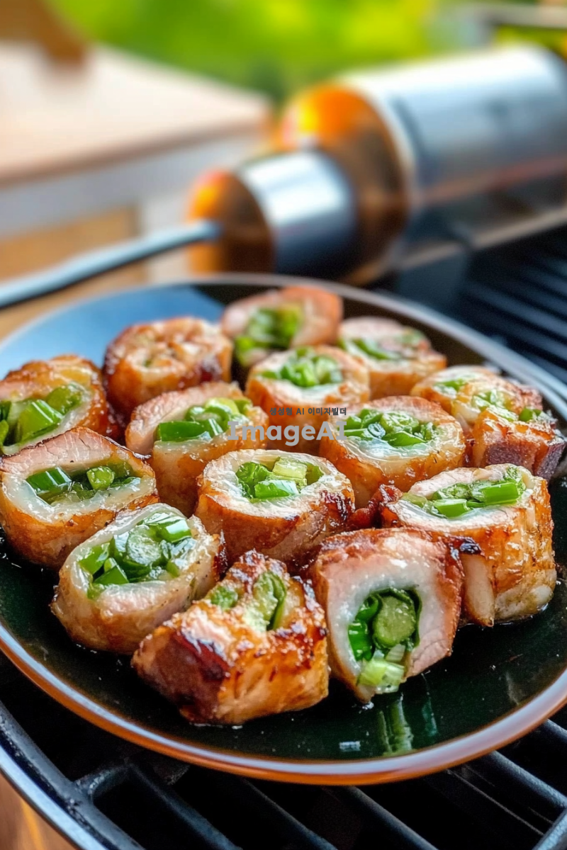 사진에는 여러 개의 돼지고기 롤과 그 안에 파가 들어 있는 타원형 접시가 있습니다. 음식은 생생한 색상과 빛나는 질감으로 매우 맛있어 보입니다. 배경에는 그릴 장비도 보이는데, 이는 야외에서 요리하거나 식사하는 전반적인 분위기를 더해줍니다. 누군가가 집이나 야외에서 이 롤을 방금 만든 것처럼 보입니다.