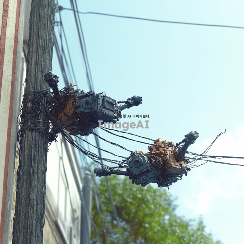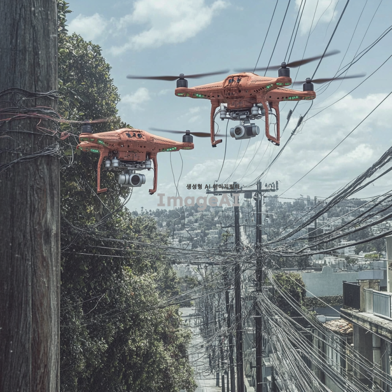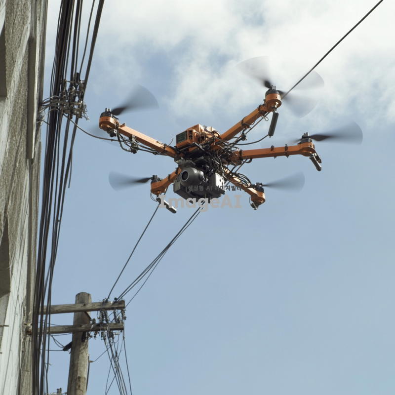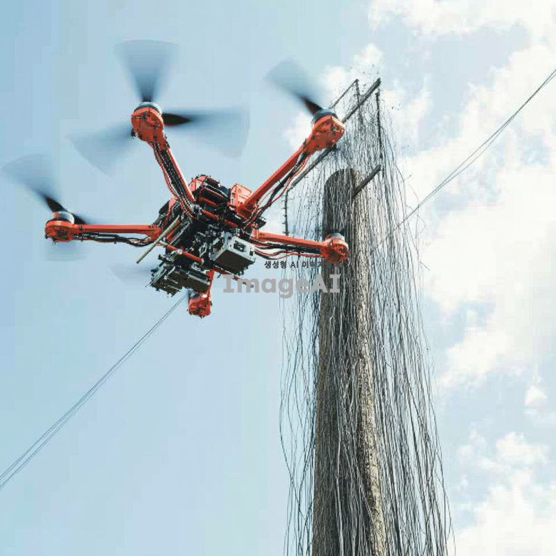 4축 날개 드론이 하늘을 날며, 하단부에 로봇팔 2개가 부착되어 전봇대 전선을 수리하는 작업을 수행하는 모습. 드론은 현대적인 디자인으로, 날개는 유선형이며 세련된 색상으로 도장되어 있다. 로봇팔은 정밀한 작업을 위해 기계적인 세부사항이 잘 표현되어 있고, 전봇대에서 로봇팔을 이용하여 전선 자르는 작업 중인 환경이 보인다. 배경은 푸른 하늘과 구름, 그리고 드론이 작업하는 장소의 풍경이 어우러진 모습.