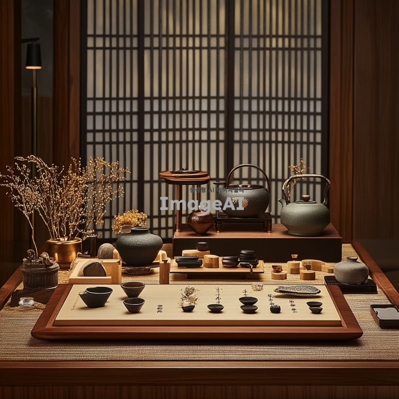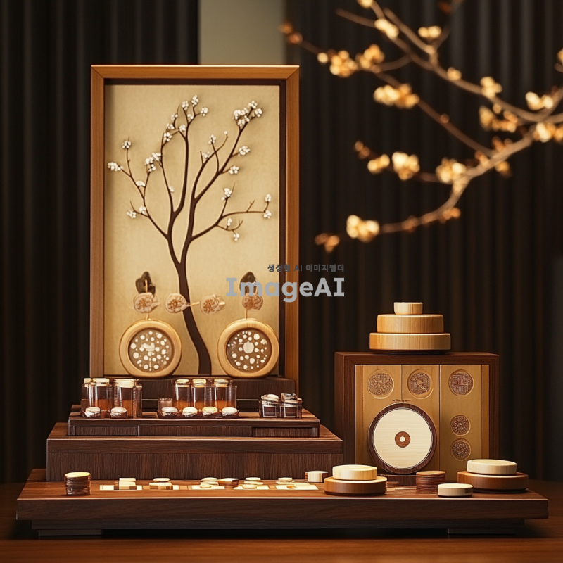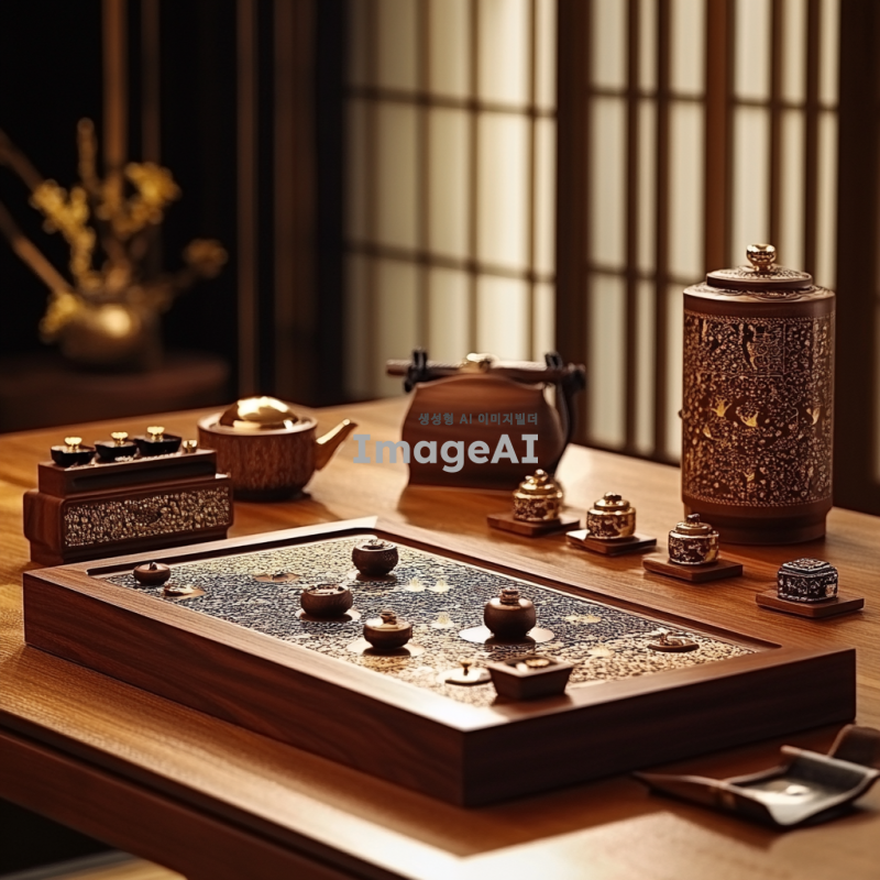 고급스러운 투병한 윷놀이 세트를 배경으로, 정교하게 디자인된 윷과 말, 고급스러운 나무 재질의 판, 섬세한 패턴이 새겨진 소품들이 조화롭게 배열된 모습. 따뜻한 조명 아래에서 우아하게 빛나는 세트의 전체적인 분위기를 강조하며, 전통적인 한국의 윷놀이 요소와 현대적인 감각이 어우러진 모습.