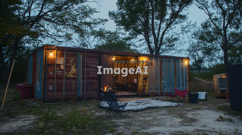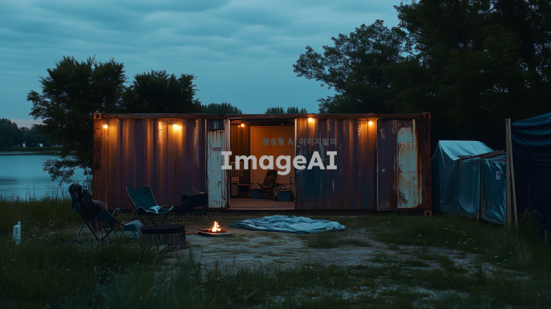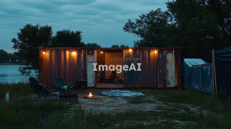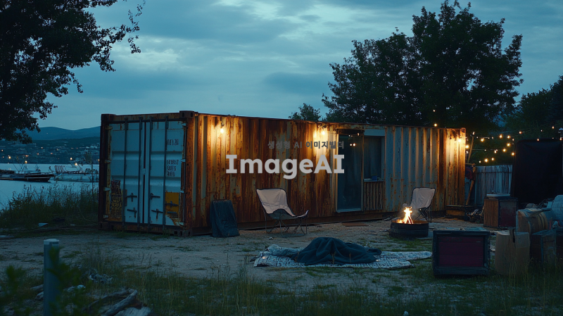 호숫가 근처에 위치한 녹슬고 낡은 큰 컨테이너, 사람의 손길이 닿아 있는 흔적이 보이는 장면. 컨테이너 앞에는 앉을 수 있는 의자와 담요가 놓여 있으며, 불을 피운 흔적이 남아 있다. 조명이 설치되어 있어 아늑한 분위기를 만들어내며, 무언가를 할 수 있는 공간이 마련되어 있다. 전체적으로 험블한 느낌의 아늑한 공간을 표현한다.