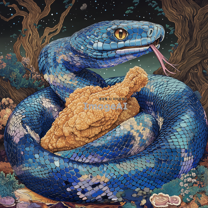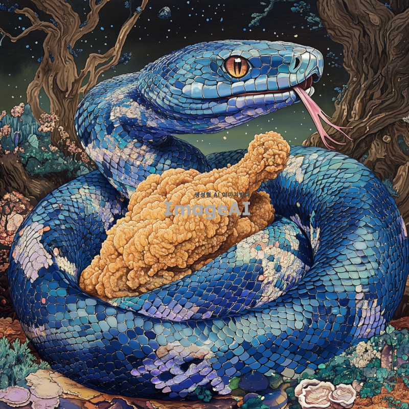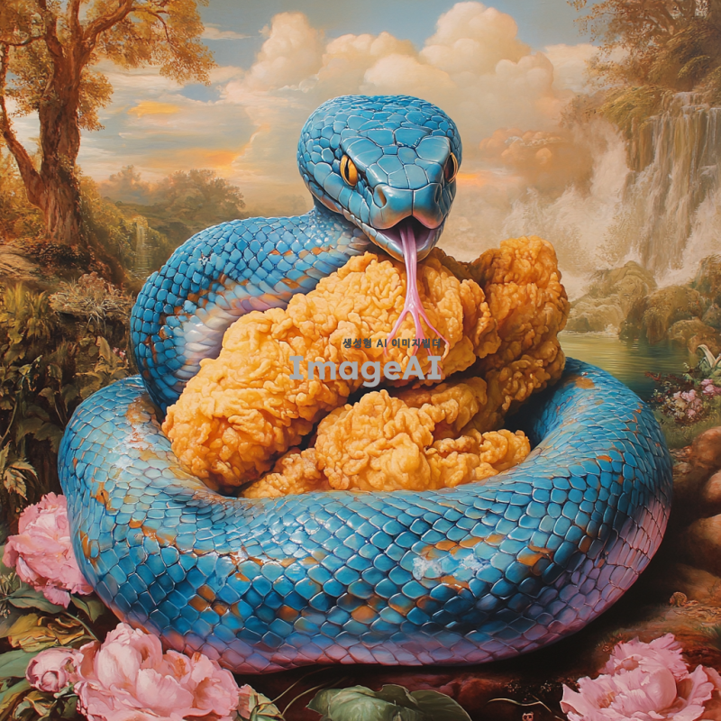 푸른 뱀이 프라이드 치킨을 감싸고 있는 모습, 뱀의 비늘이 반짝이며 생동감 넘치는 색상으로 표현되고, 치킨은 바삭하고 맛있어 보이는 디테일로 묘사됨. 배경은 자연의 풍경으로, 뱀과 치킨이 조화롭게 어우러진 장면을 그려냄.
