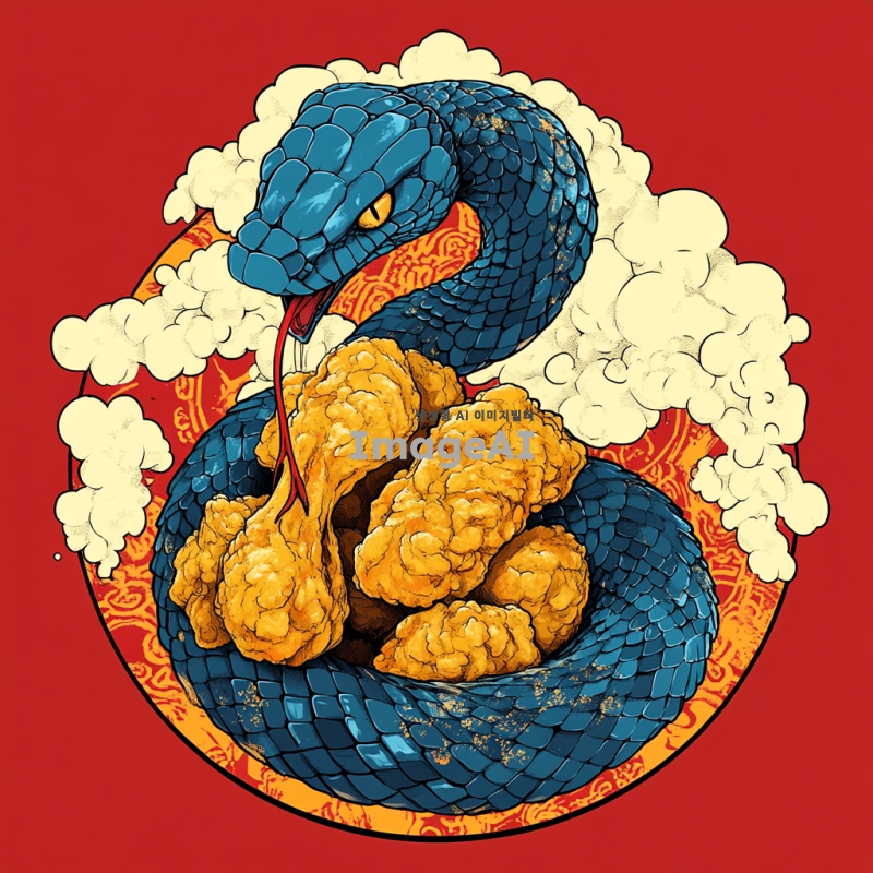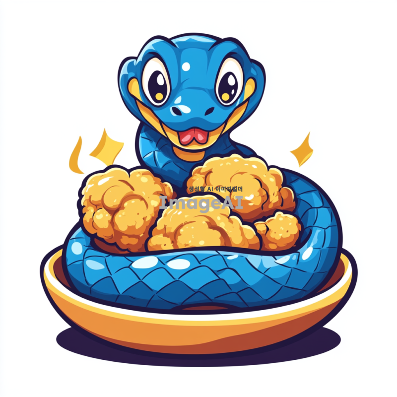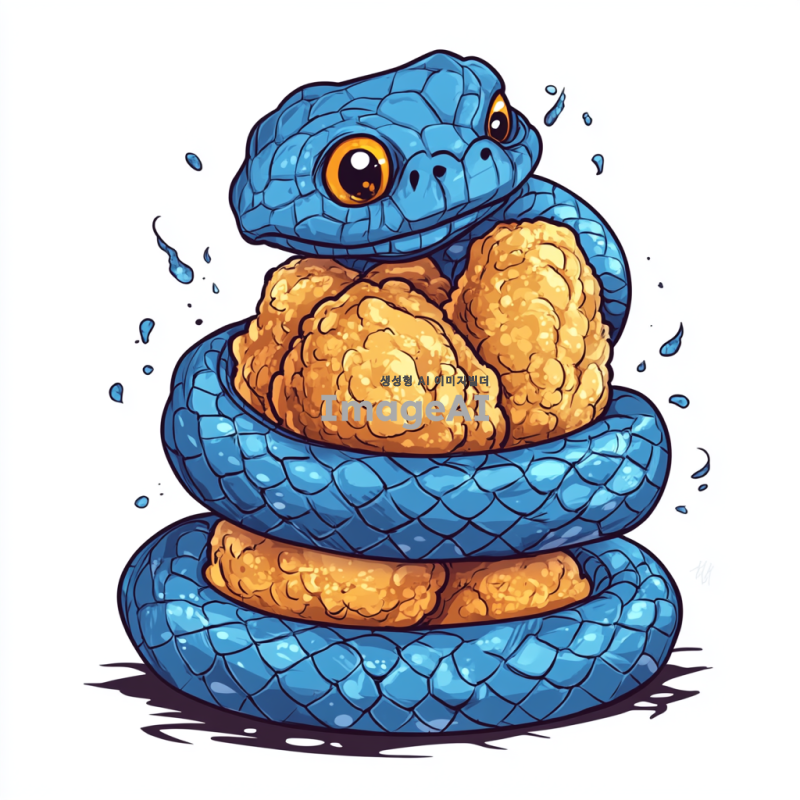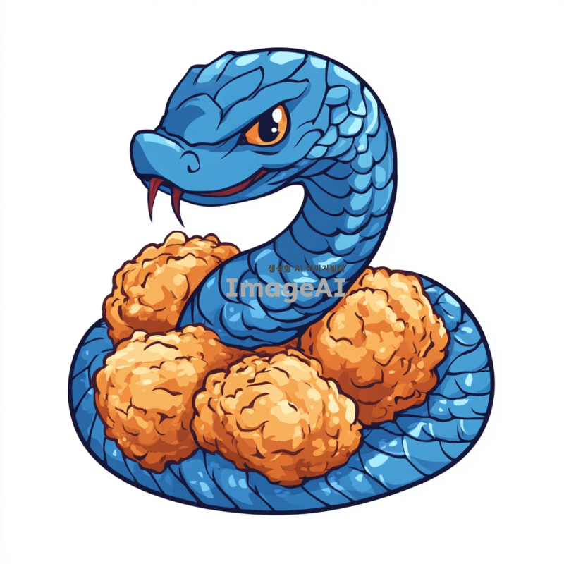 푸른 뱀이 프라이드 치킨을 감싸고 있는 모습, 배경 없이, 캐릭터 스타일로, 한국인 디자인 요소가 포함된 이미지