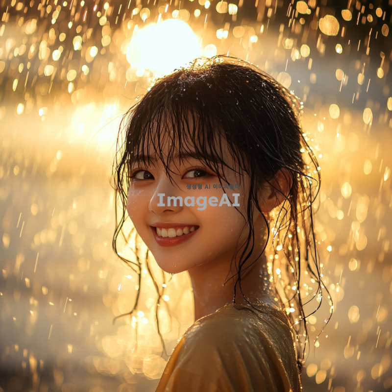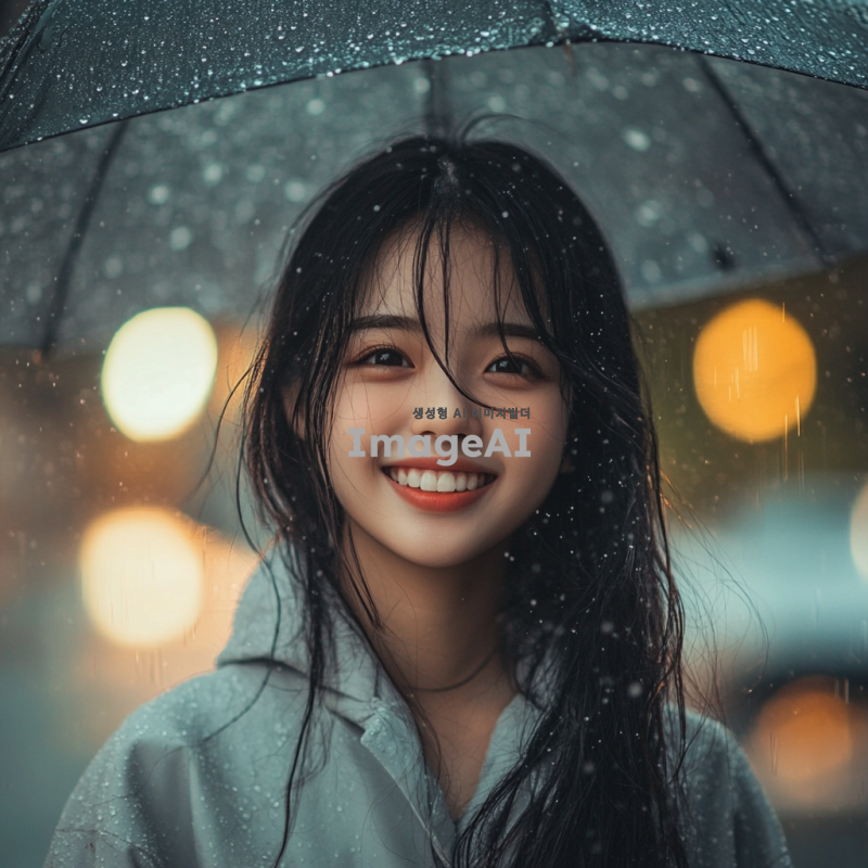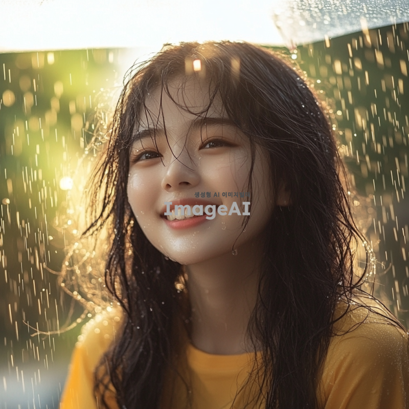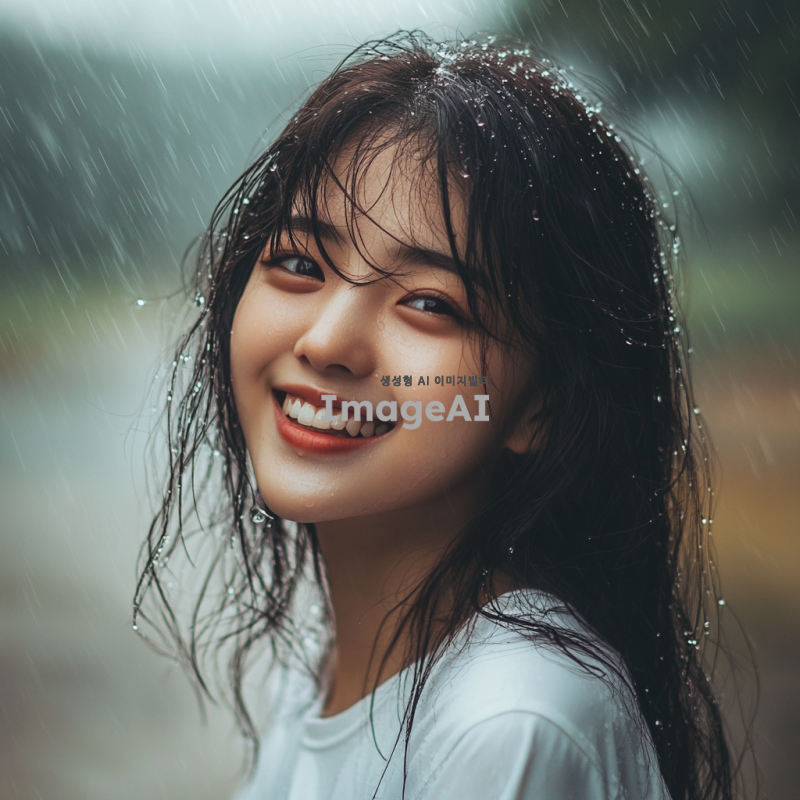비에 젖어 있는 한국인 소녀, 큰 미소를 지으며 자연스럽고 생동감 있게 표현, 배경은 비 오는 풍경으로 설정, 부드러운 조명과 따뜻한 색감으로 분위기 강조.