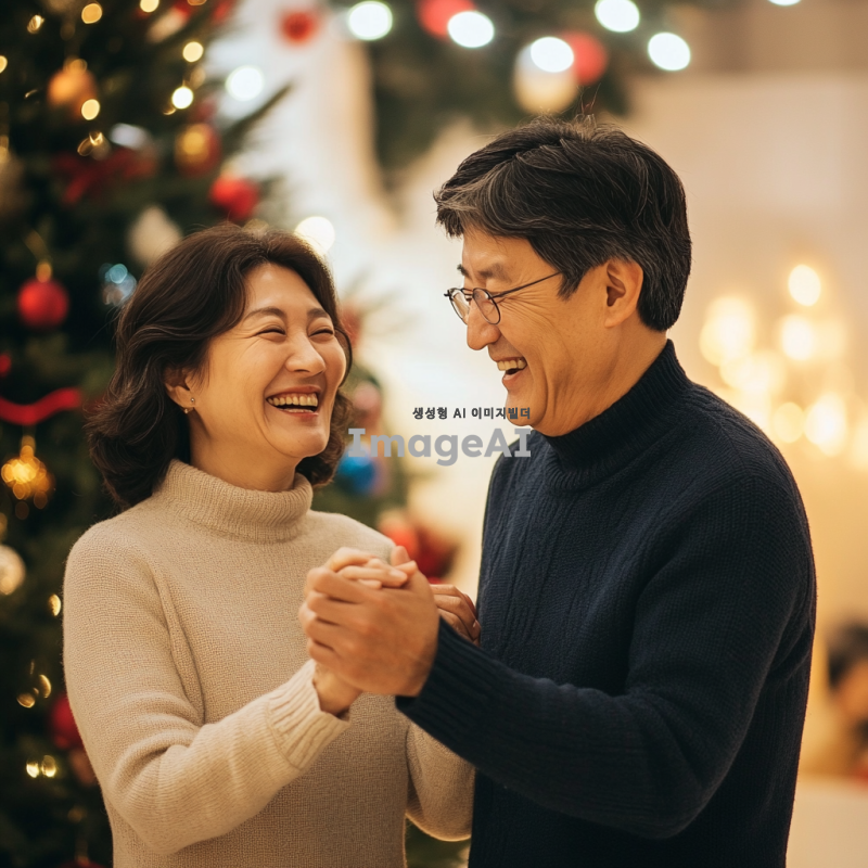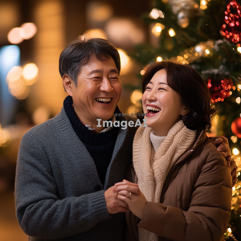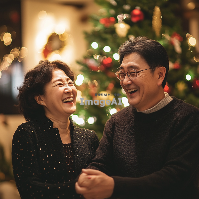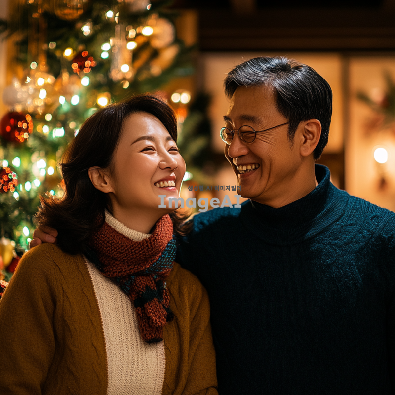중년의 한국인 부부가 따뜻한 크리스마스 분위기 속에서 함께 웃고 있는 모습, 크리스마스 트리와 화려한 장식들, 아늑한 실내에서 서로의 손을 잡고 있는 장면, 행복한 표정과 따뜻한 조명, 겨울의 정취가 느껴지는 배경