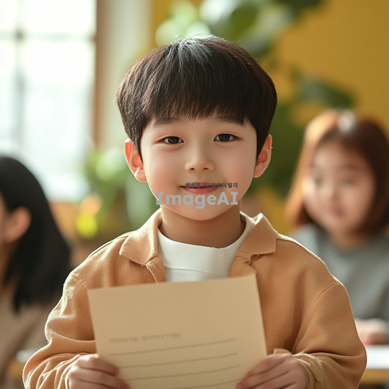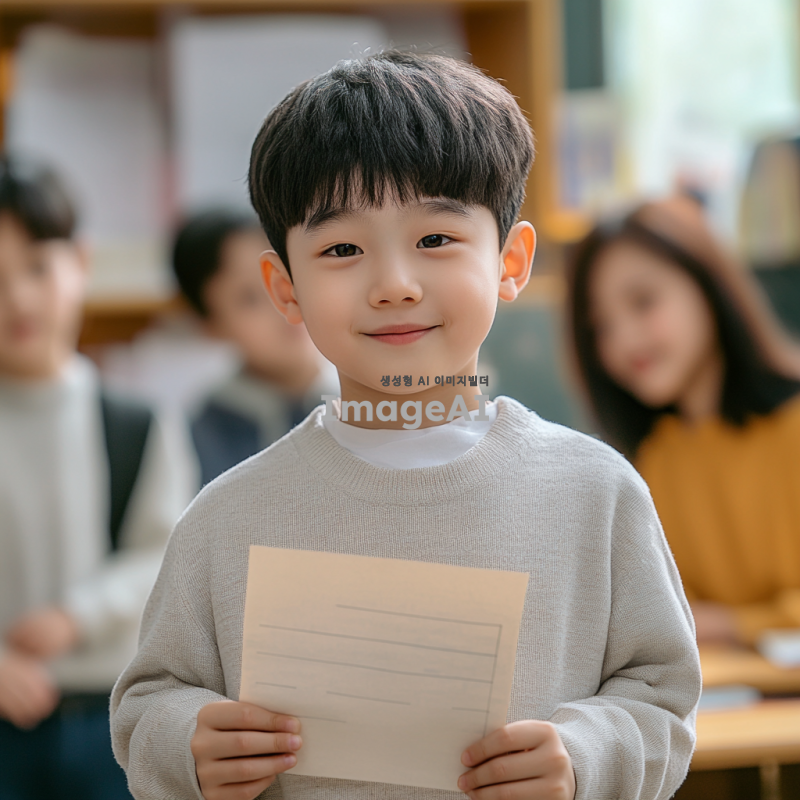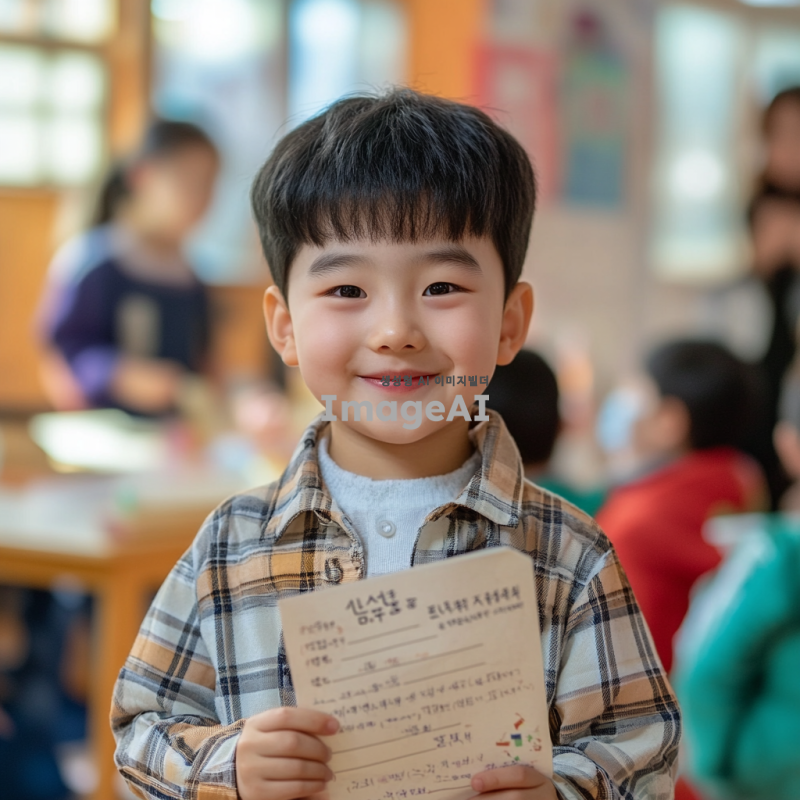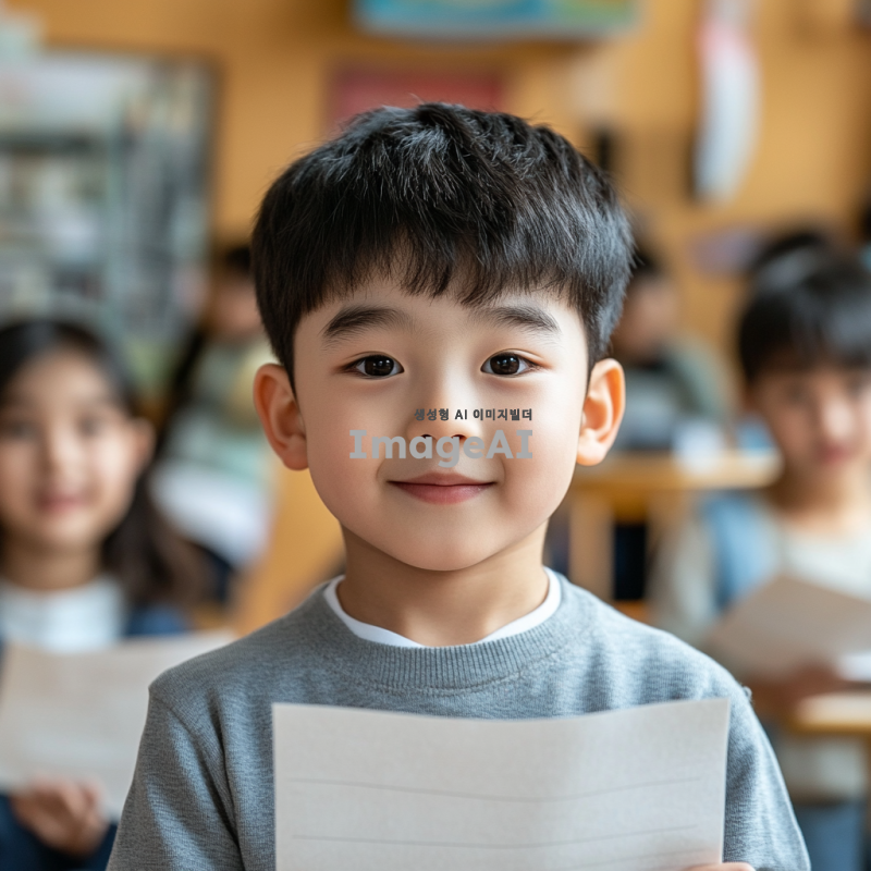초등학교 2학년 남자아이, 밝고 친근한 표정, 학교 교실 배경, 손에 자기소개서 들고 있는 모습, 귀여운 캐주얼 옷을 입고, 짧은 머리 스타일, 한국의 전통적인 정서가 느껴지는 모습, 주변에 친구들이 있는 장면, 따뜻한 분위기