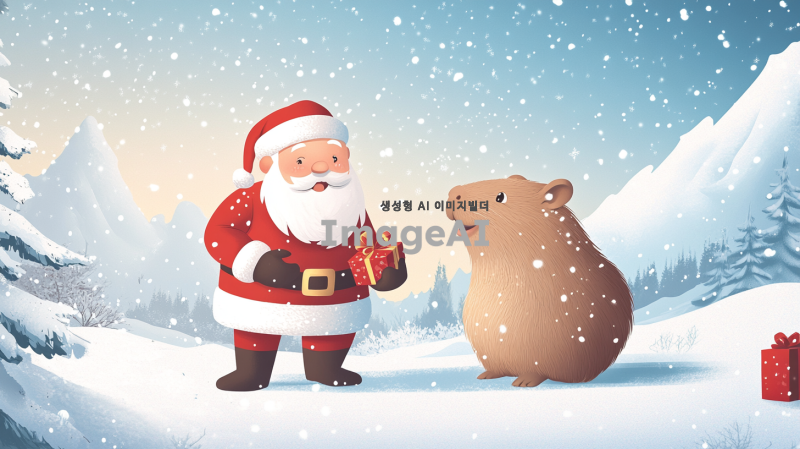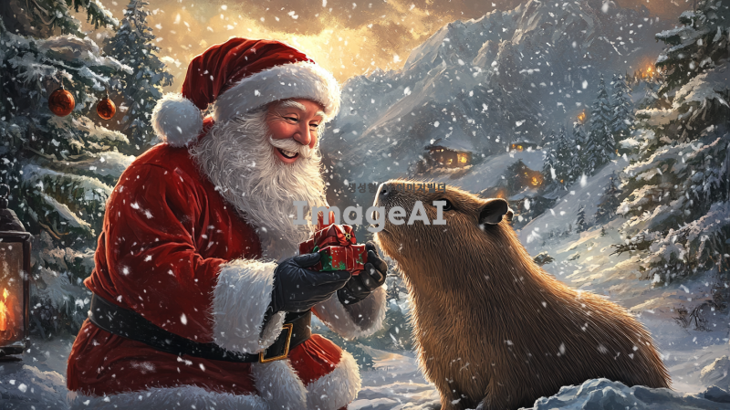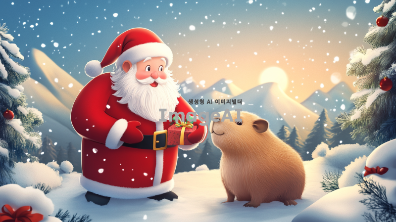 산타클로스와 카피바라가 함께 있는 겨울 풍경, 눈 덮인 산과 나무들, 산타클로스는 웃으며 카피바라에게 선물을 주고 있는 모습, 따뜻한 조명 아래 아늑한 분위기, 카피바라는 귀엽고 행복한 표정으로 산타를 바라보고 있음.