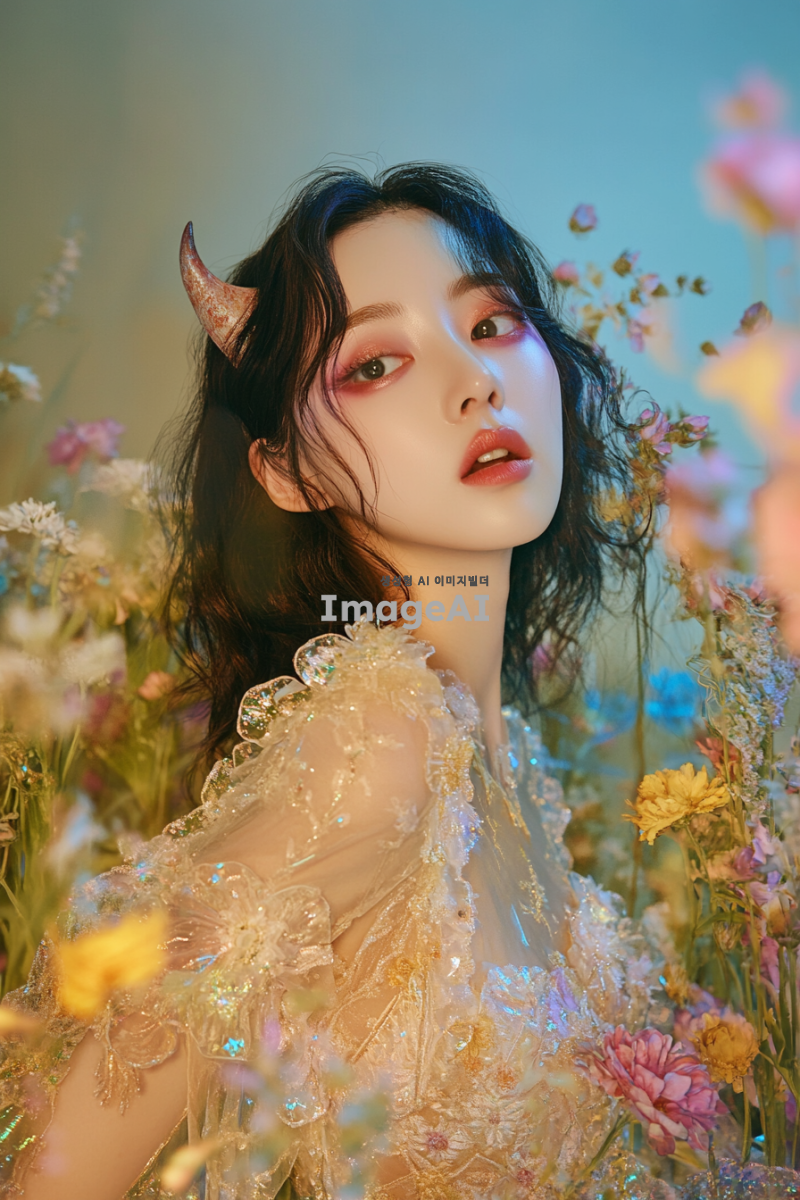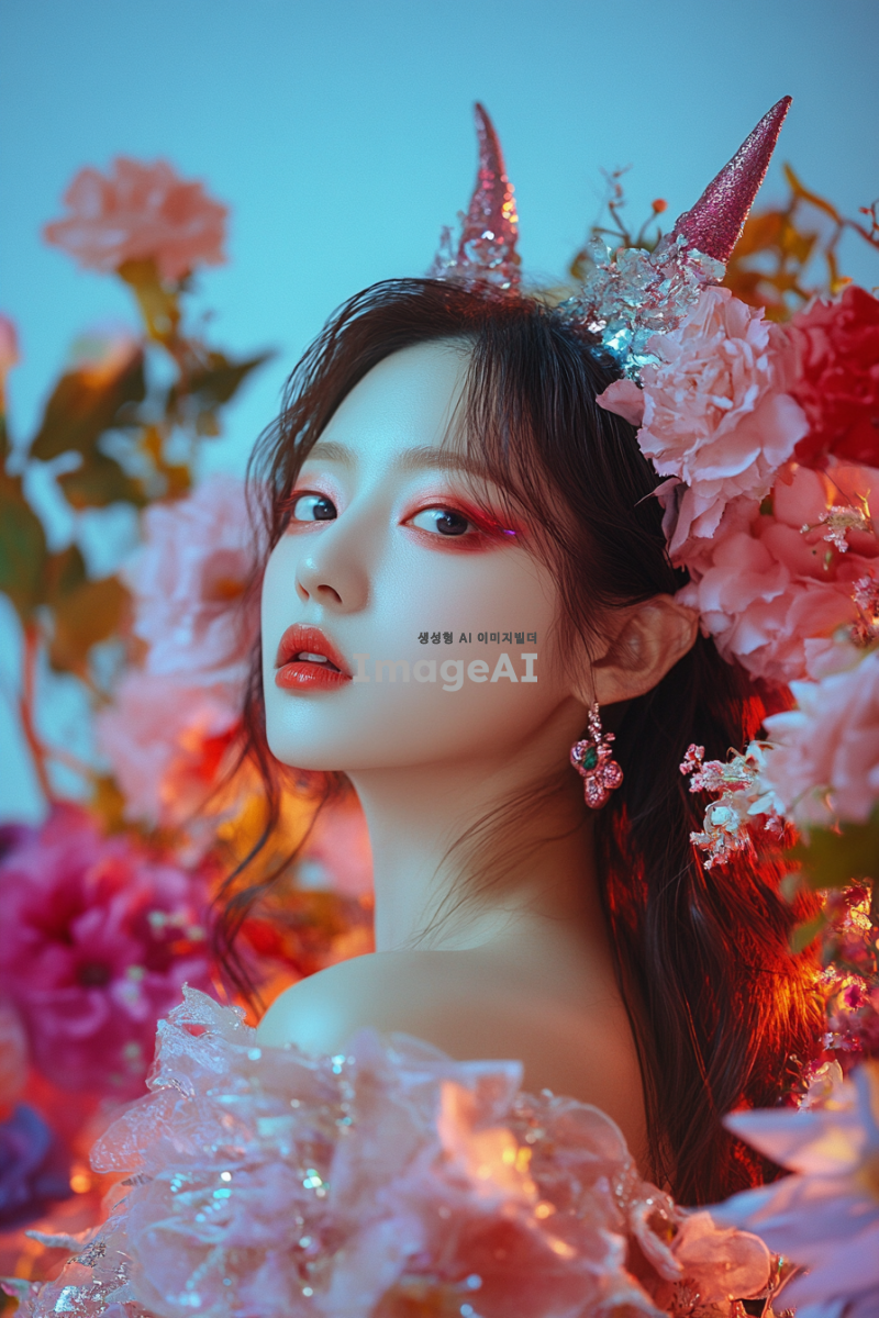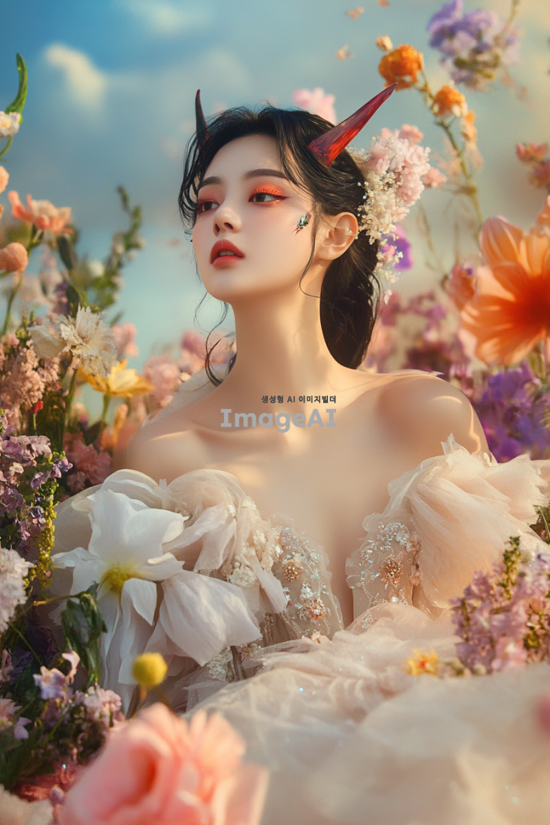 초현실적인 공주나라의 배경 속에서, 화려한 드레스를 입고 있는 한국인 여성, 그녀의 얼굴은 독특한 악마 메이크업으로 장식되어 있으며, 뾰족한 귀와 화려한 색상의 눈화장이 특징적이다. 주변에는 환상적인 꽃과 기이한 생물들이 어우러져 있고, 하늘은 오묘한 색조로 물들어 있다. 전체적인 분위기는 몽환적이고 신비로운 느낌을 주며, 마법적인 요소들이 가득한 장면을 연출한다.