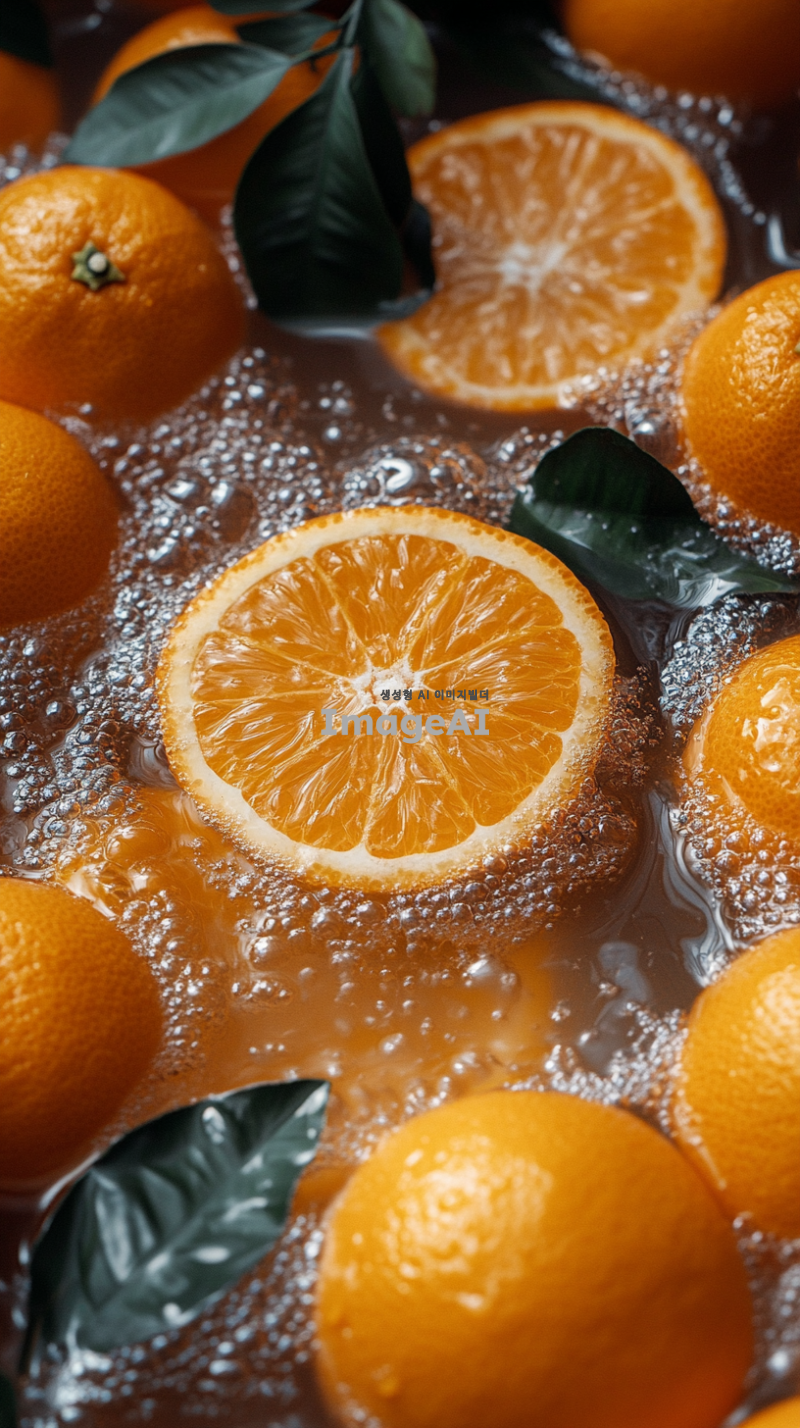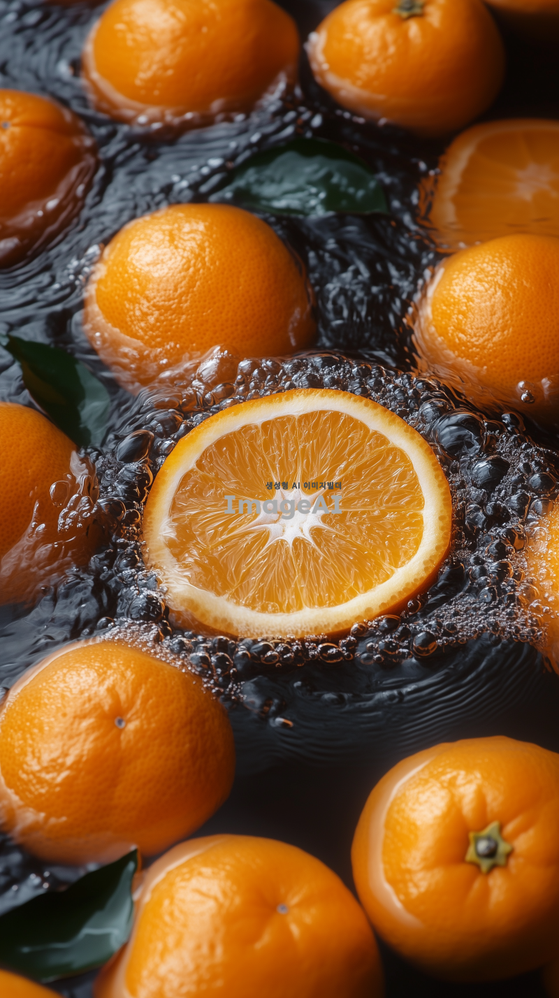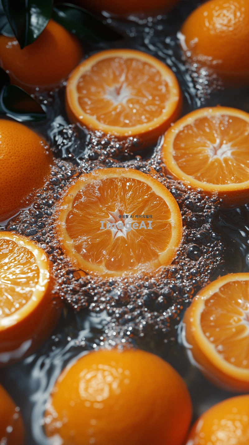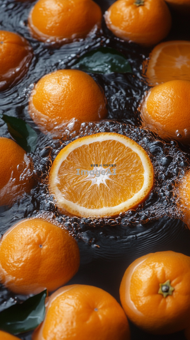 많은 오렌지가 물위에 떠있다