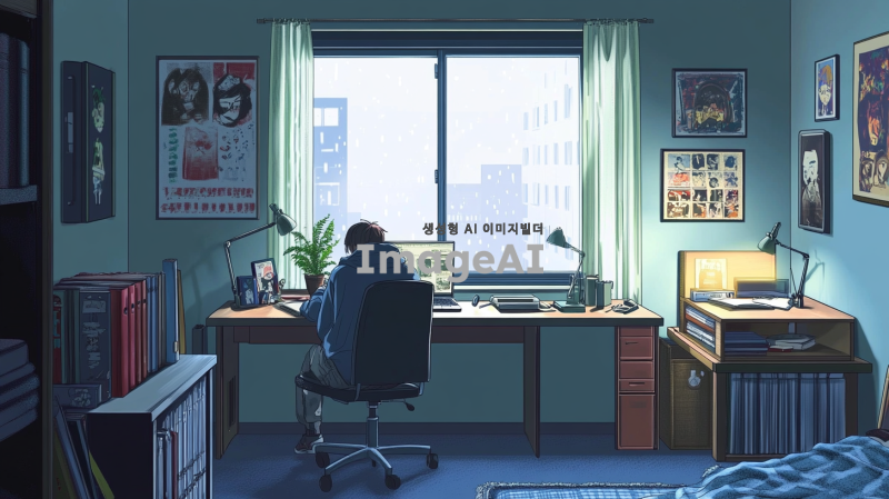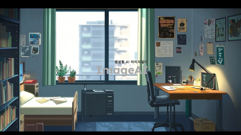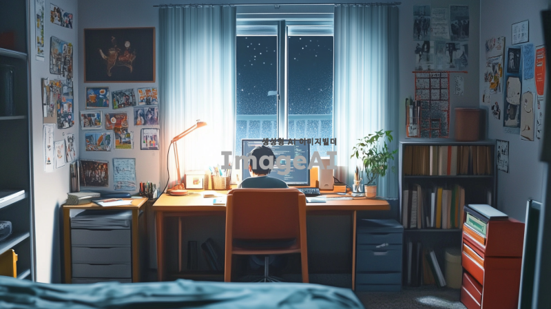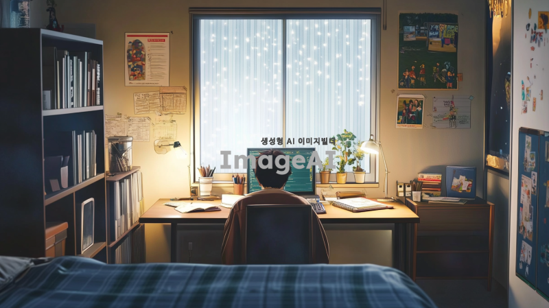 어두운 밤, 침대가 없는 학생 방. 책상 위에 공부하는 학생의 모습, 벽에는 다양한 포스터와 그림이 붙어있고, 창가에는 작은 식물이 놓여있다. 방 안은 아늑한 조명으로 밝혀져 있으며, 바닥에는 책과 노트가 흩어져 있다. 분위기는 집중할 수 있는 차분하고 조용한 느낌.