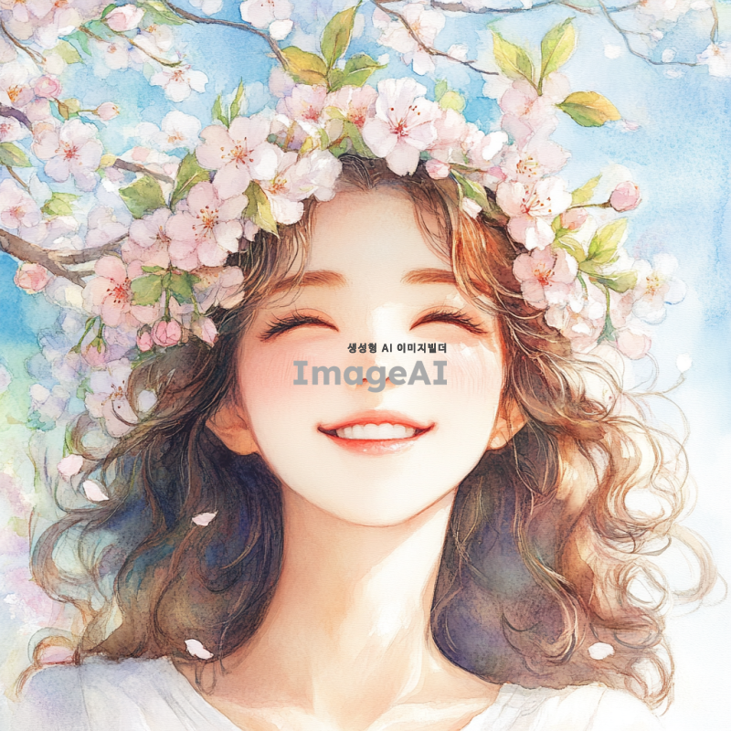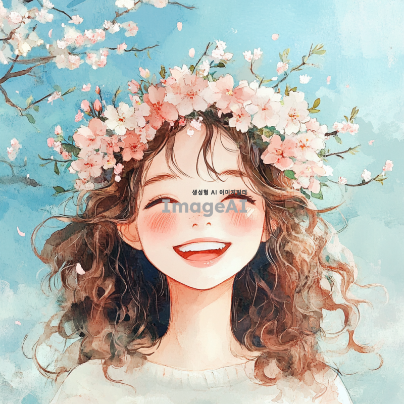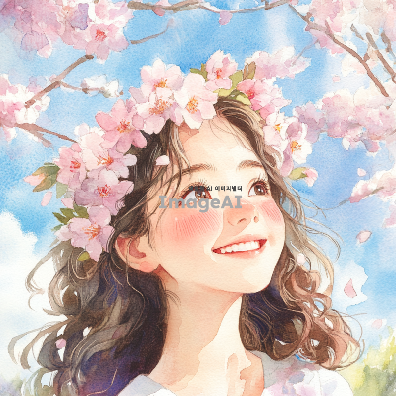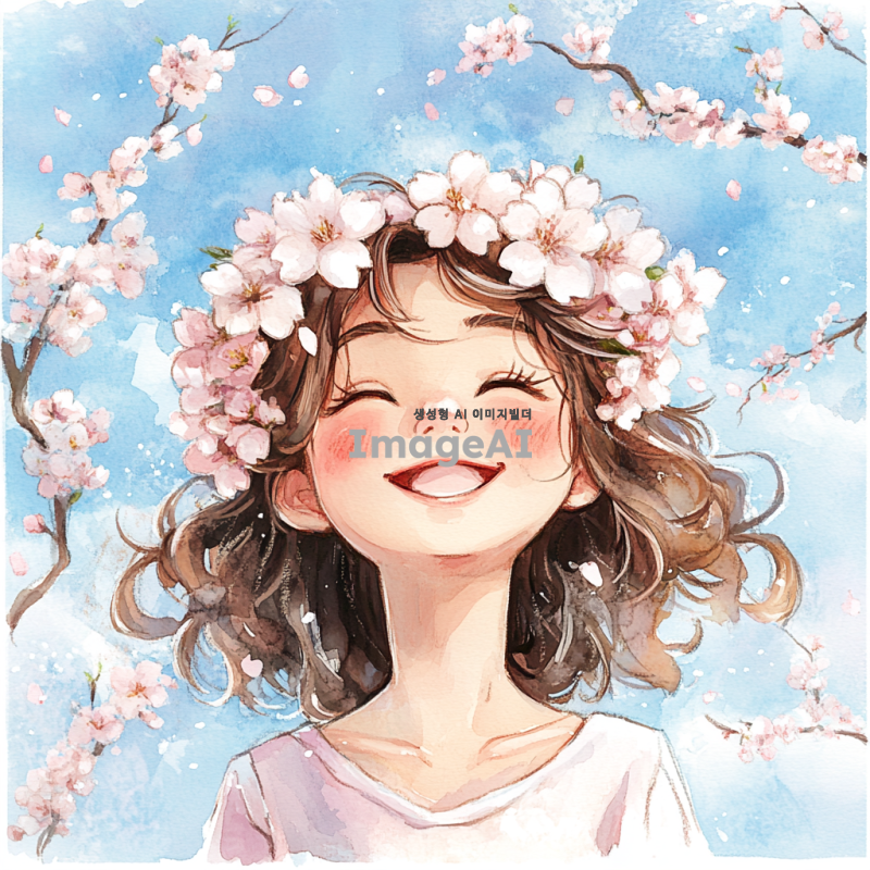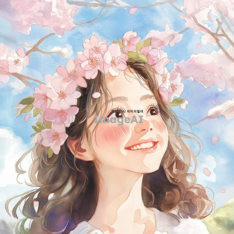 갈색 곱슬 머리를 가진 한국 소녀가 따사로운 봄날, 벚꽃으로 만든 화관을 쓰고 행복한 웃음을 짓고 있는 모습을 수채화 스타일로 표현해 주세요. 배경에는 부드러운 파스텔 색상의 벚꽃이 만개한 나무와 푸른 하늘이 어우러져 있는 장면을 담아주세요.