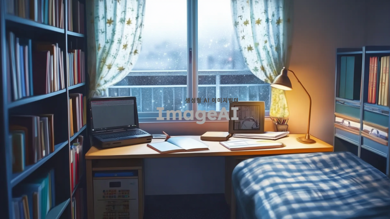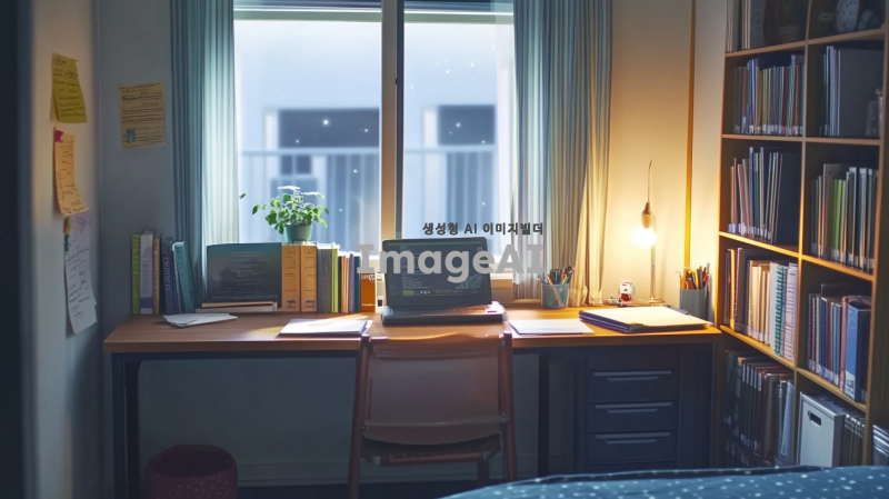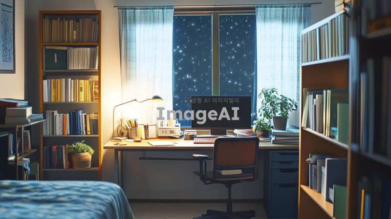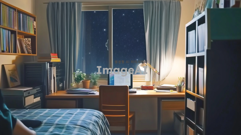 작은 학생 방, 늦은 저녁의 분위기, 침대가 없는 방, 책상 위에 책과 공부 도구들이 흩어져 있는 모습, 부드러운 조명이 방 안을 따뜻하게 비추고, 창문 너머로 보이는 어두운 하늘과 별들, 아늑한 느낌의 인테리어.