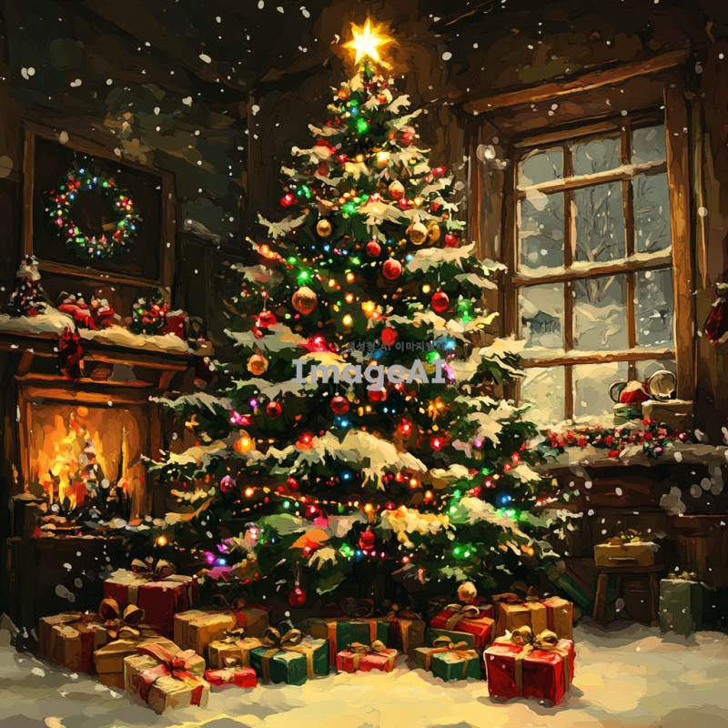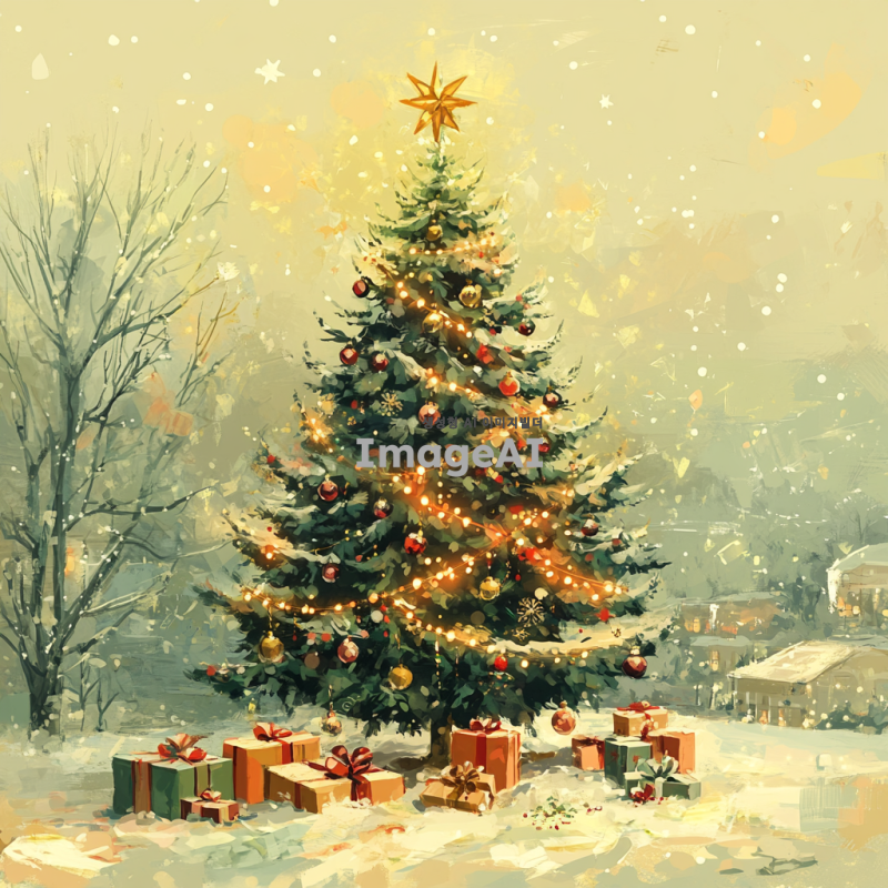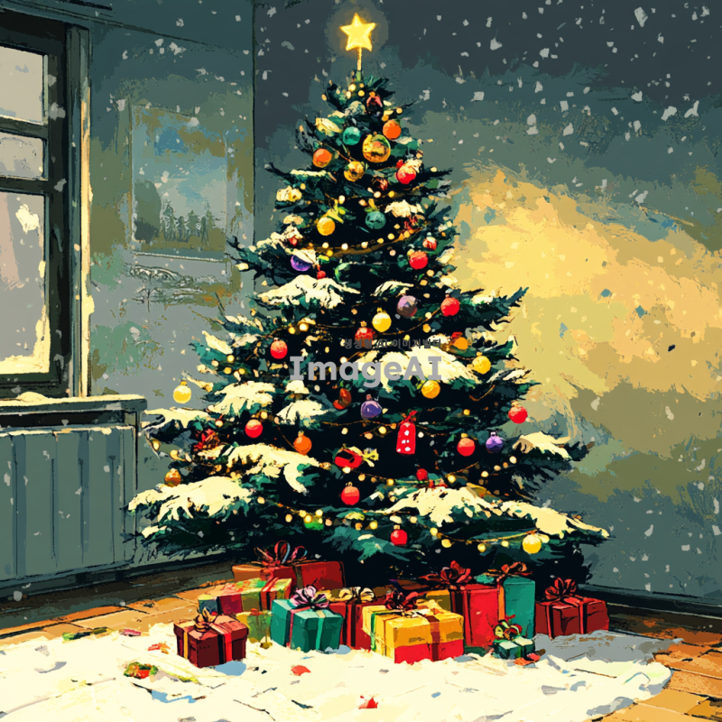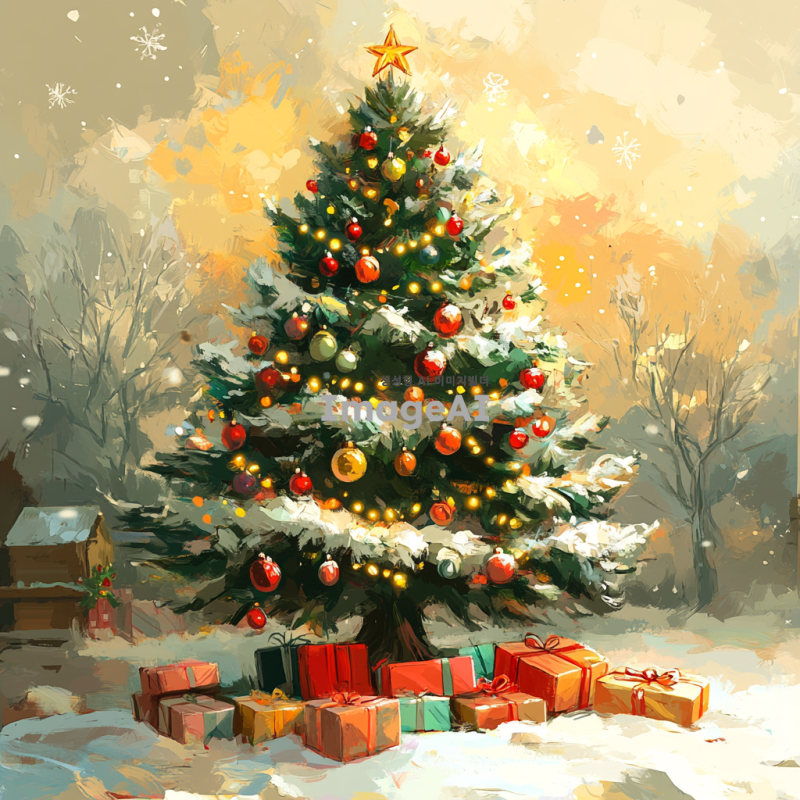 어설프게 그려진 크리스마스 트리, 다양한 색상의 장식과 조명이 어우러져 있는 모습, 나무는 비대칭적이고 불균형하게 그려져 있으며, 바닥에는 선물들이 어지럽게 놓여져 있는 장면, 따뜻한 크리스마스 분위기를 느낄 수 있는 배경, 한국의 겨울 풍경이 어우러진 설정.