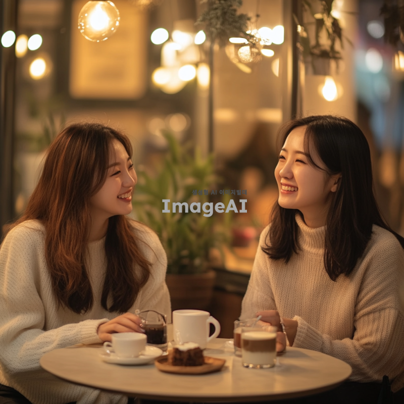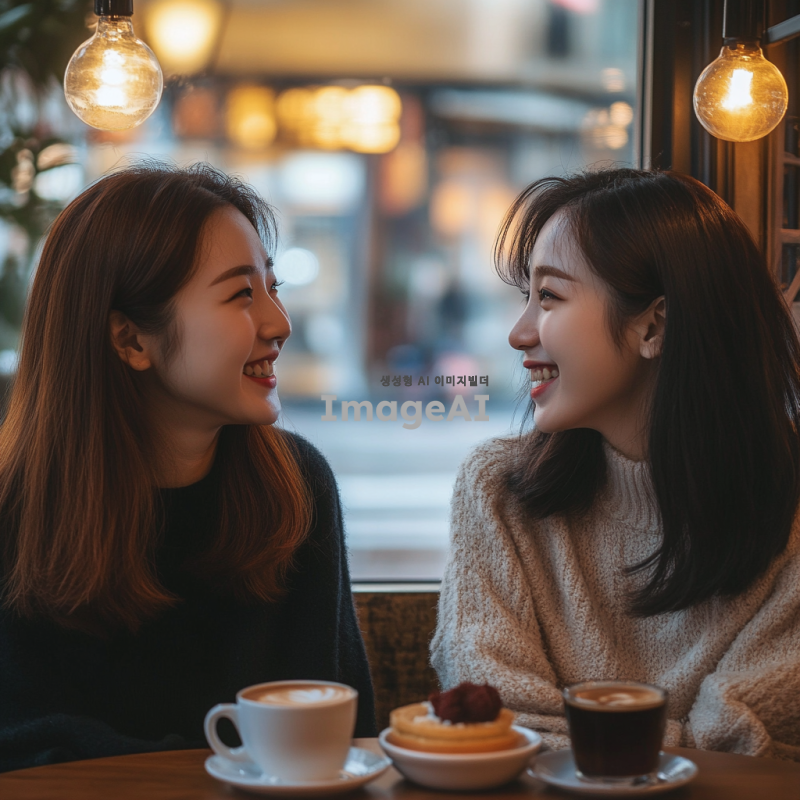 따뜻한 분위기의 카페에서 서로 이야기를 나누고 있는 한국인 친구들, 서로의 눈을 바라보며 웃고 있는 모습, 테이블 위에는 커피와 디저트가 놓여 있고, 주변에는 아늑한 조명이 비치고 있는 장면, 진정한 인간적 연결을 상징하는 따뜻한 감정이 느껴지는 이미지.