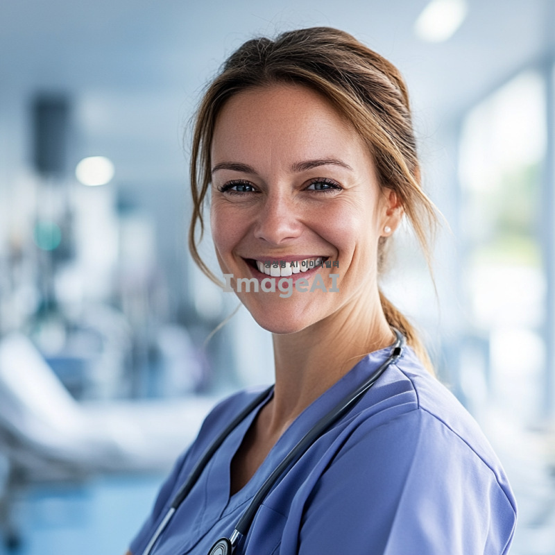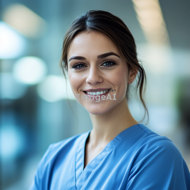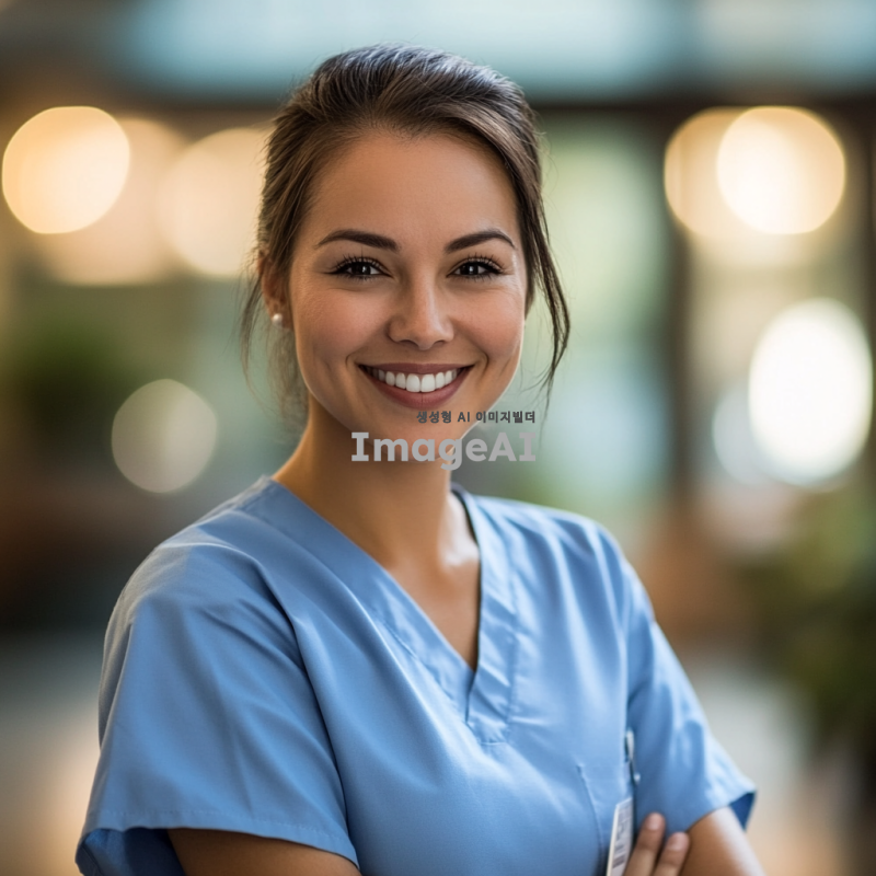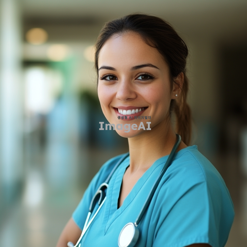 깔끔한 유니폼을 입고, 친절하게 미소 짓고 있는 간호사, 현대적인 병원 배경, 따뜻한 분위기, 전문성과 신뢰감을 주는 이미지