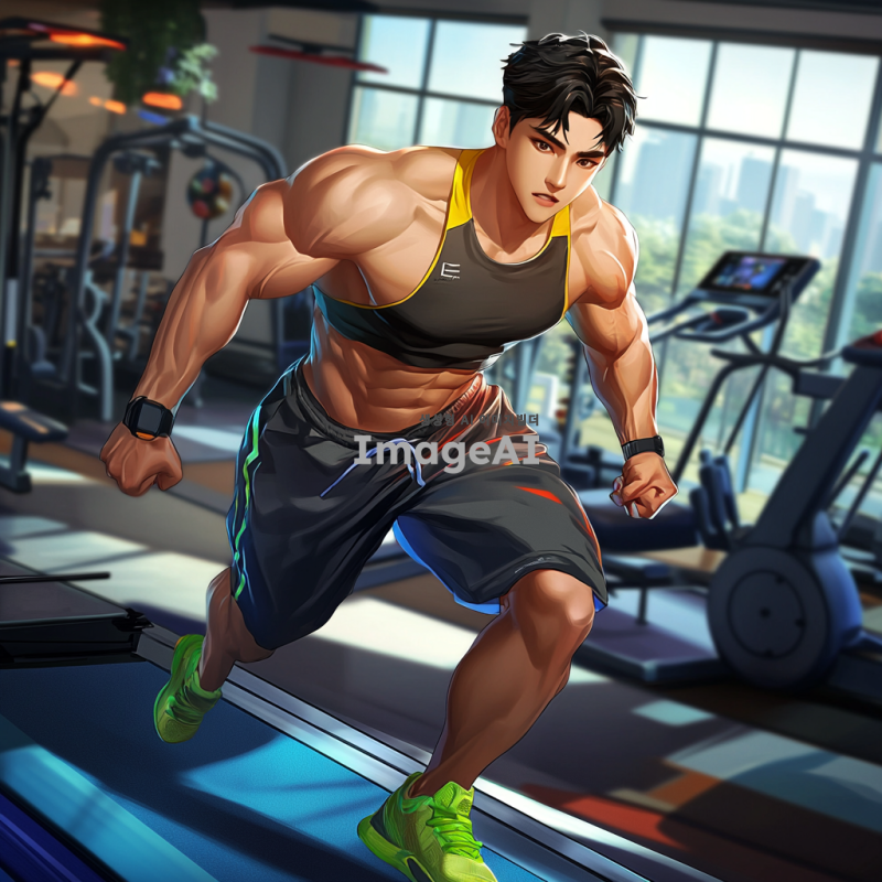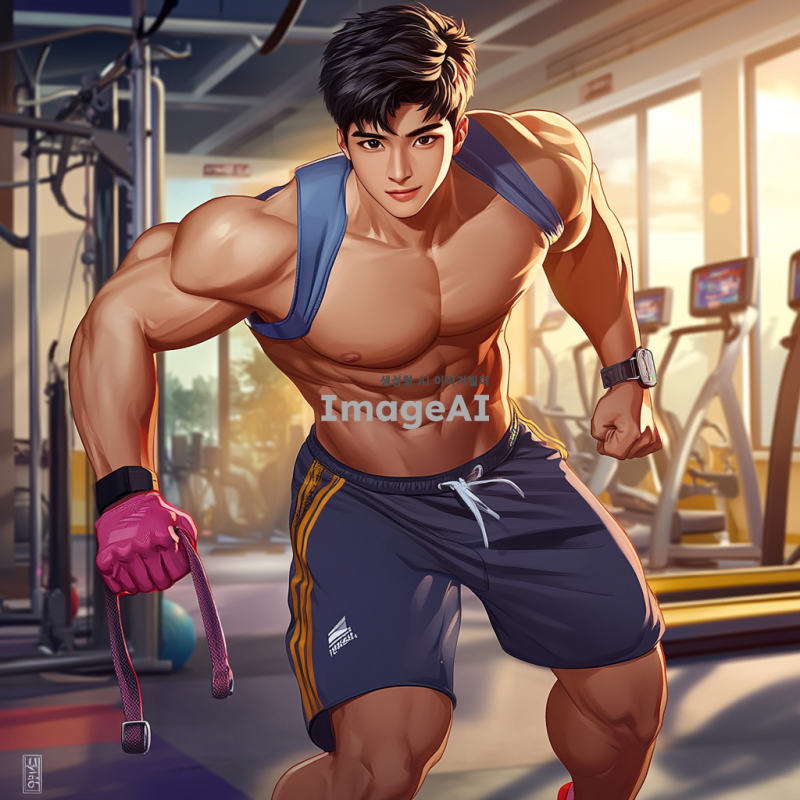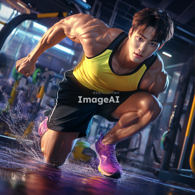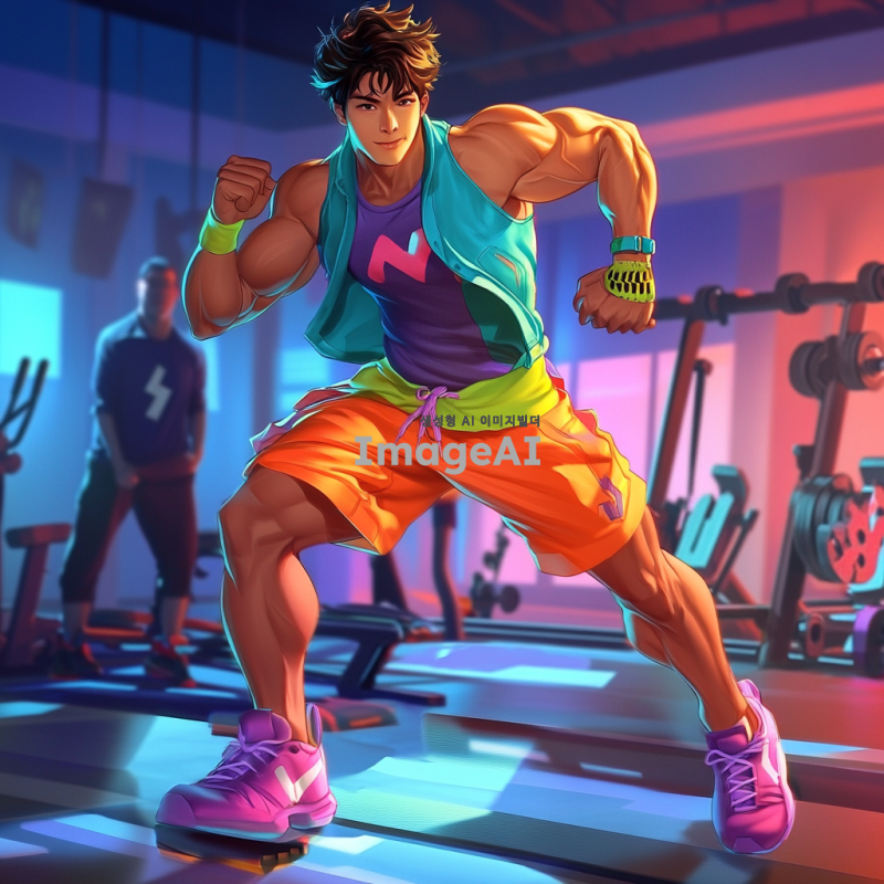 운동복을 입고 활기차게 운동하는 한국인 남성 캐릭터, 강한 체격과 자신감 넘치는 표정, 배경은 헬스장으로 설정, 다양한 운동 기구가 보이는 모습, 역동적인 자세로 운동하는 모습, 밝고 에너지가 넘치는 색감, 현대적인 스타일의 운동화와 액세서리 착용.