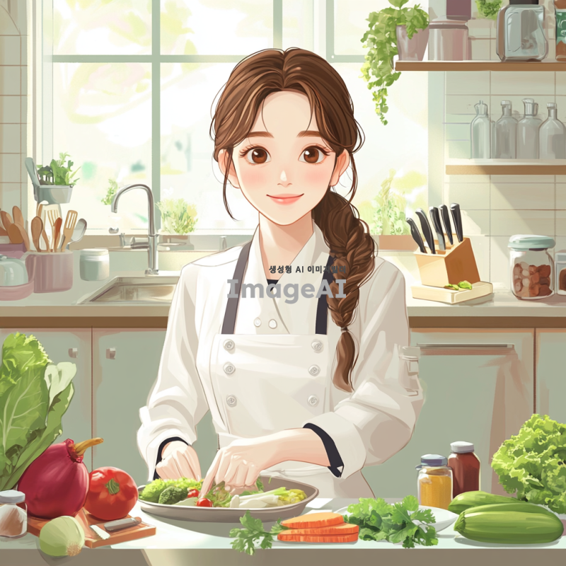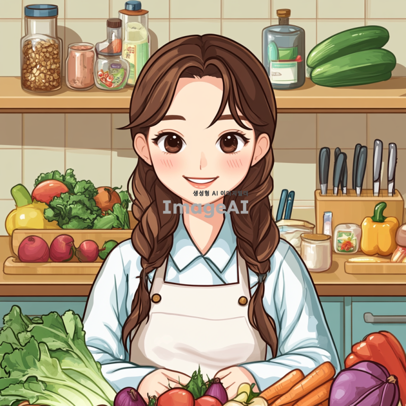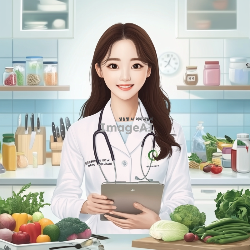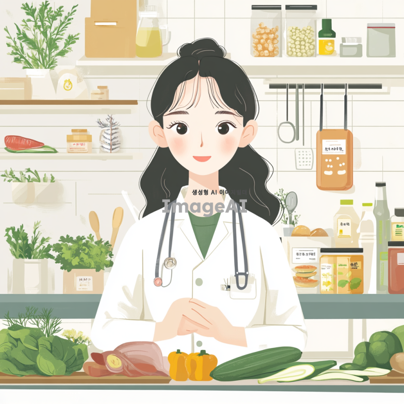 한국의 여자 영양사 캐릭터, 밝고 친근한 표정, 다양한 건강식품과 신선한 채소들로 가득한 주방 배경, 전문적인 유니폼을 입고 있으며, 식단 상담을 하는 모습, 건강한 식생활을 강조하는 포스터 스타일, 따뜻한 색감과 아기자기한 디테일.