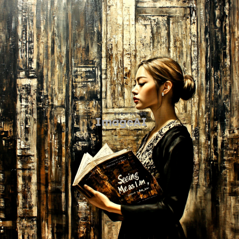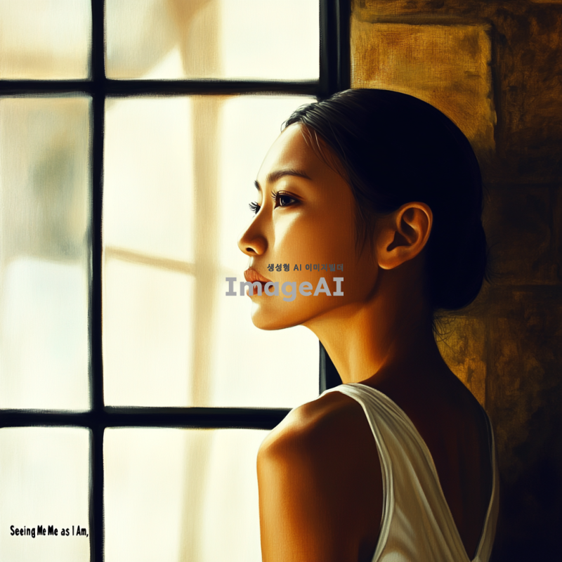 사유에 잠긴 한국 여성의 모습, 부드러운 자연광이 비치는 배경, 깊은 생각에 잠긴 표정, 책의 제목 '있는 그대로 나를 바라보기'가 잘 어울리는 편안한 분위기, 따뜻한 색감으로 감성적인 느낌을 강조한 그림.