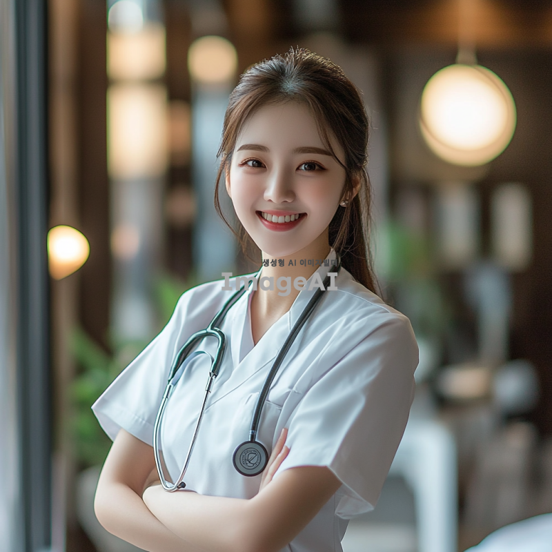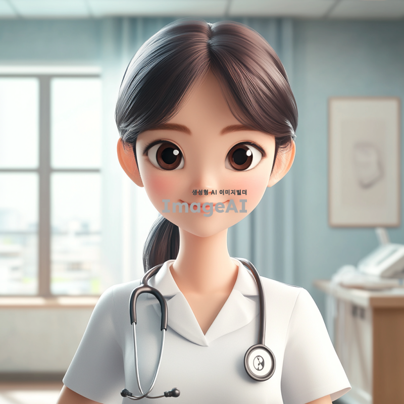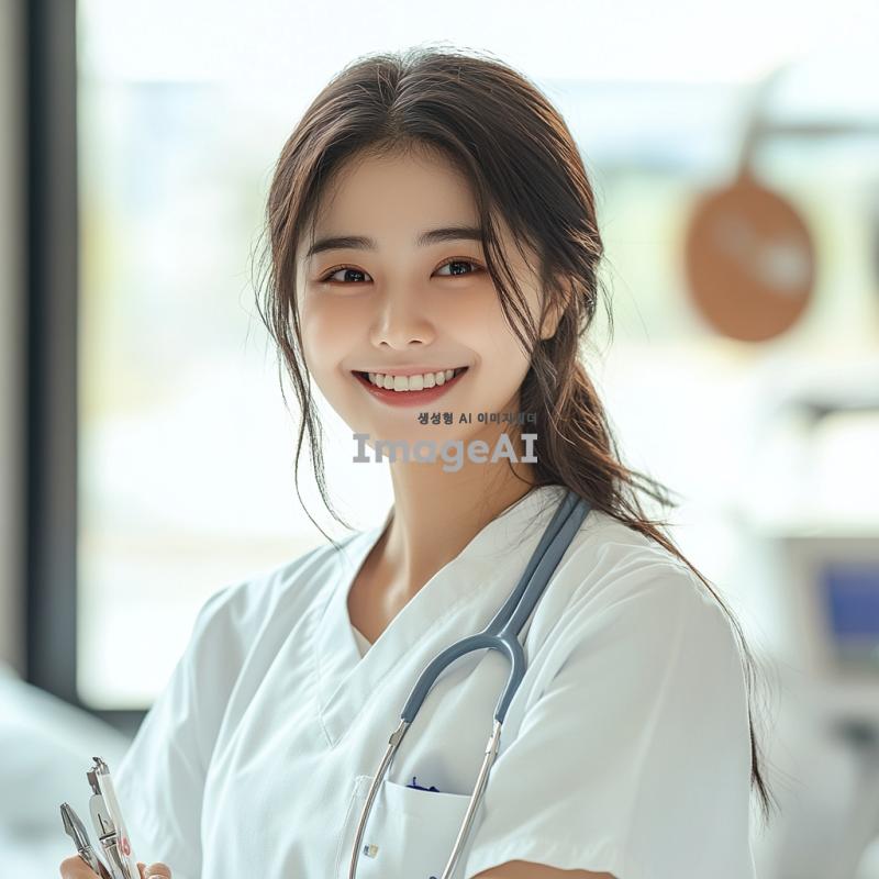한국의 병원에서 일하는 간호사 캐릭터, 밝은 미소를 지닌 젊은 여성, 흰색 간호복과 스크럽을 입고, 의료 도구를 손에 들고 있는 모습, 배경에는 병원 내부가 보이고, 환자를 돌보는 따뜻한 분위기, 친근하고 전문적인 느낌, 자연광이 들어오는 창문이 있는 공간.
