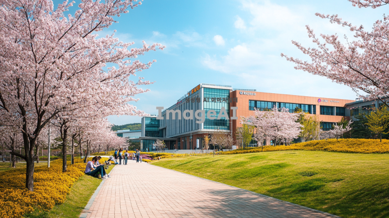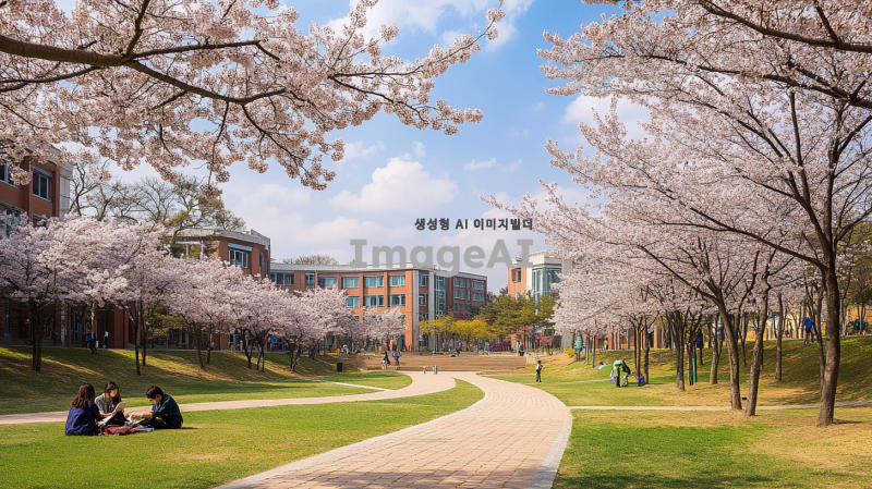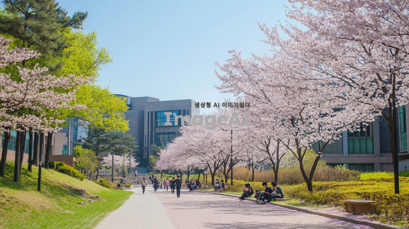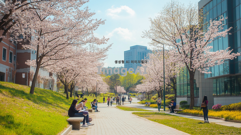한국의 대학교 교정을 배경으로 한 이미지, 푸른 잔디와 현대적인 건물들이 조화를 이루고 있으며, 학생들이 책을 읽거나 대화하는 모습, 벚꽃이 만개한 나무들이 늘어선 길, 맑은 하늘과 햇살이 비치는 따뜻한 날씨, 활기찬 캠퍼스 분위기