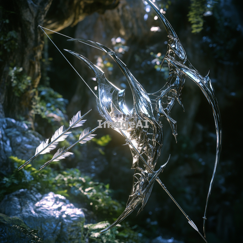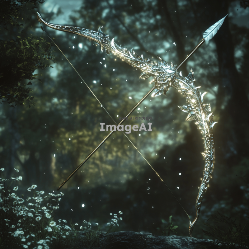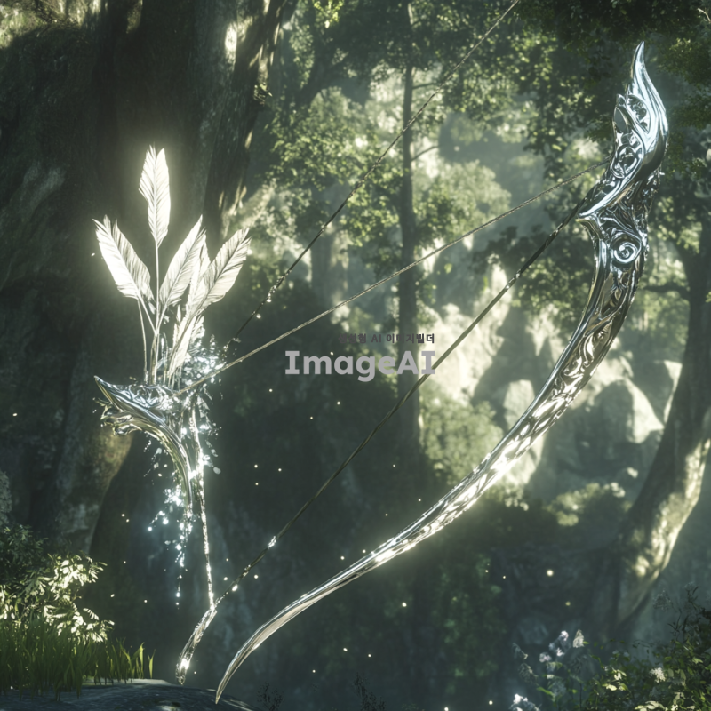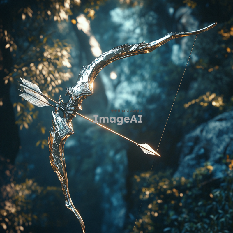 실버 색상의 활과 화살이 조화를 이루는 모습, 세련된 디자인의 활은 빛나는 금속성 질감으로, 화살은 날카로운 팁과 섬세한 깃털 장식이 있는 형태로, 배경은 자연의 숲 속 풍경으로 설정하여 신비로운 분위기를 강조한 장면.