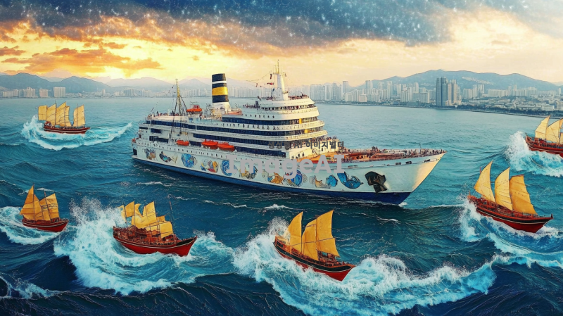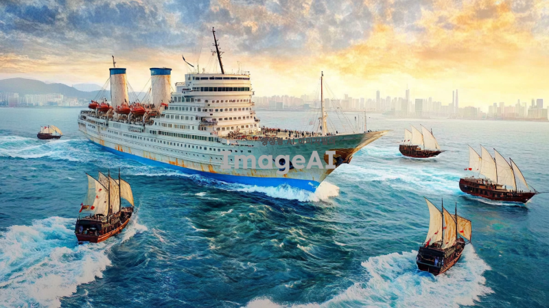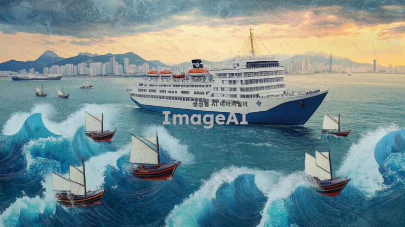 큰 배가 파도에 흔들리지 않고 안정적으로 떠 있는 모습과 그 주위에서 파도에 흔들리는 작은 배들이 함께 있는 장면을 그려주세요. 배들은 모두 한국의 전통적인 디자인 요소를 포함하고, 배경에는 푸른 바다와 하늘이 어우러진 풍경을 추가해 주세요. 큰 파도를 표현해주세요