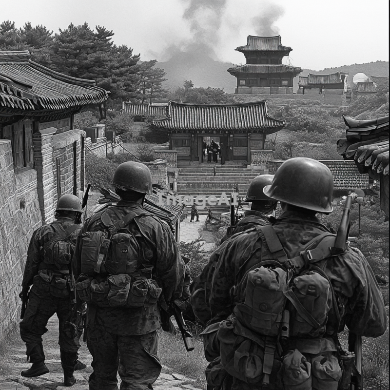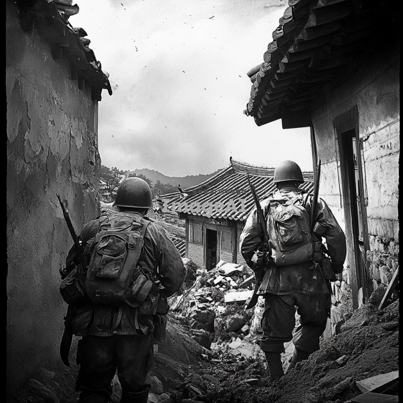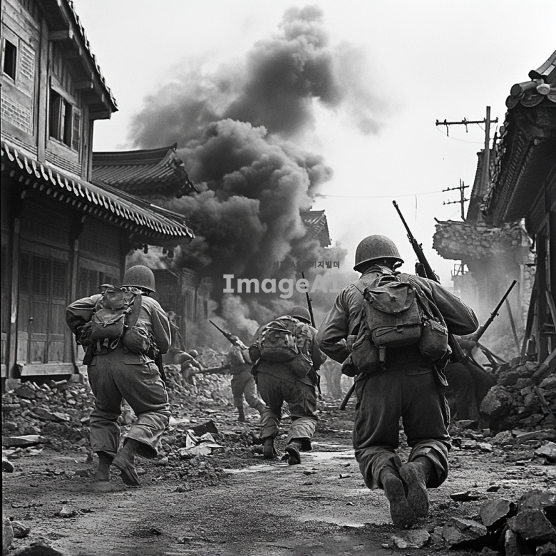 1950년대 한국 전쟁의 전투 장면, 한국군과 유엔군이 협력하여 전투하는 모습, 포화 속에서의 긴장감, 전쟁의 참상과 희생, 전통적인 한국 건축물 배경, 흑백 사진 스타일, 고전적인 느낌, 역사적 사실성을 강조한 장면.