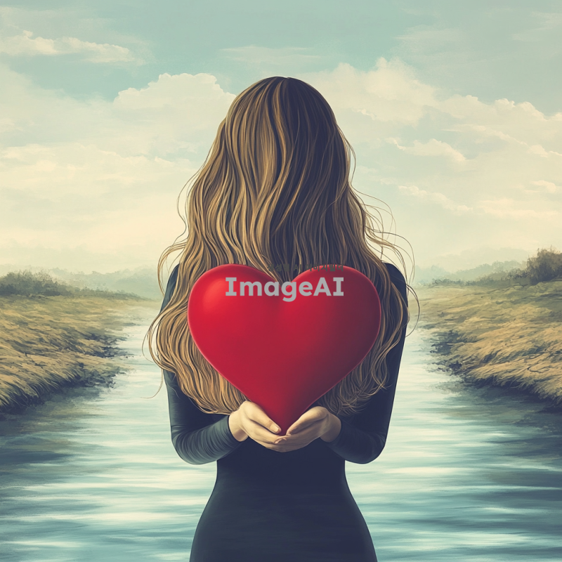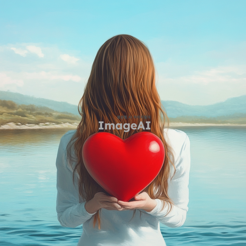 고요한 강 위에 빨간색 하트가 떠다니고 있는 장면. 하트를 들고 있는 웨이브 파마 긴 머리의 여자의 뒷모습으로 보인다. 배경은 잔잔한 물결과 푸른 하늘이 어우러진 평화로운 풍경.