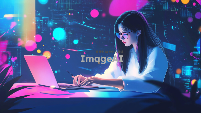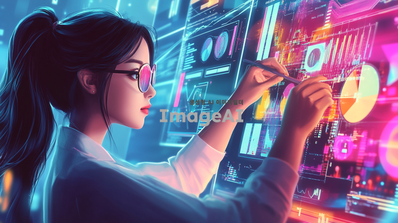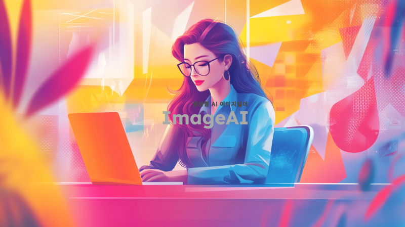 버추얼 크리에이터 매니저 포트폴리오 표지 디자인, 현대적이고 세련된 느낌, 한국인 여성 캐릭터가 디지털 기기를 사용하며 창의적으로 작업하는 모습, 배경은 화려한 그래픽과 컬러풀한 요소들로 구성, 전문성과 혁신성을 강조하는 스타일, 포트폴리오 제목이 잘 보이도록 디자인, 전체적으로 밝고 긍정적인 분위기.