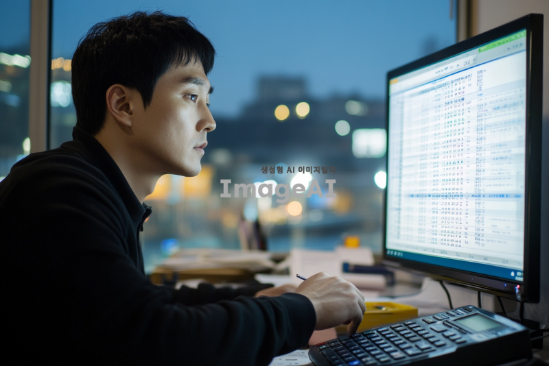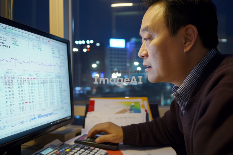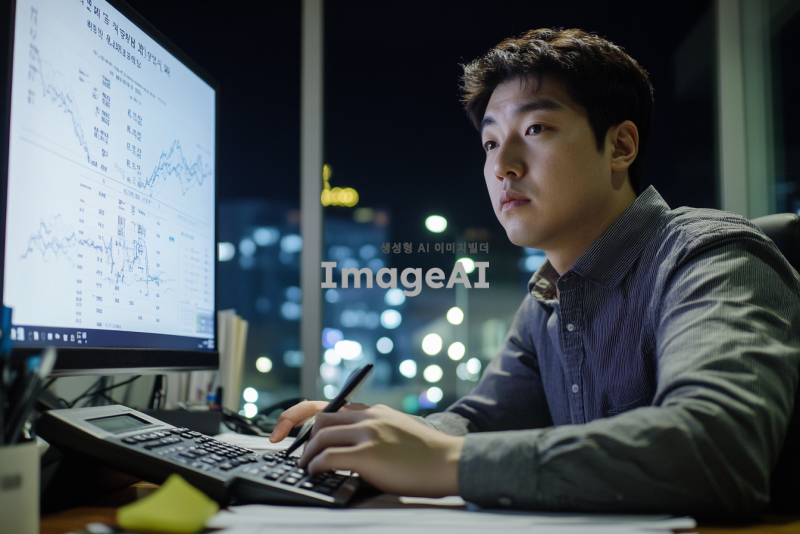 연말정산을 위한 세금 절세 계산기를 사용하는 한국인 남성이 사무실에서 집중해서 계산하는 모습. 컴퓨터 화면에는 복잡한 숫자와 그래프가 표시되어 있고, 주변에는 세금 관련 서류와 계산기가 놓여 있다. 남성은 진지한 표정으로 화면을 바라보며 손가락으로 계산기를 조작하고 있다. 사무실은 현대적이고 깔끔한 분위기로, 창밖에는 도시의 야경이 보인다.