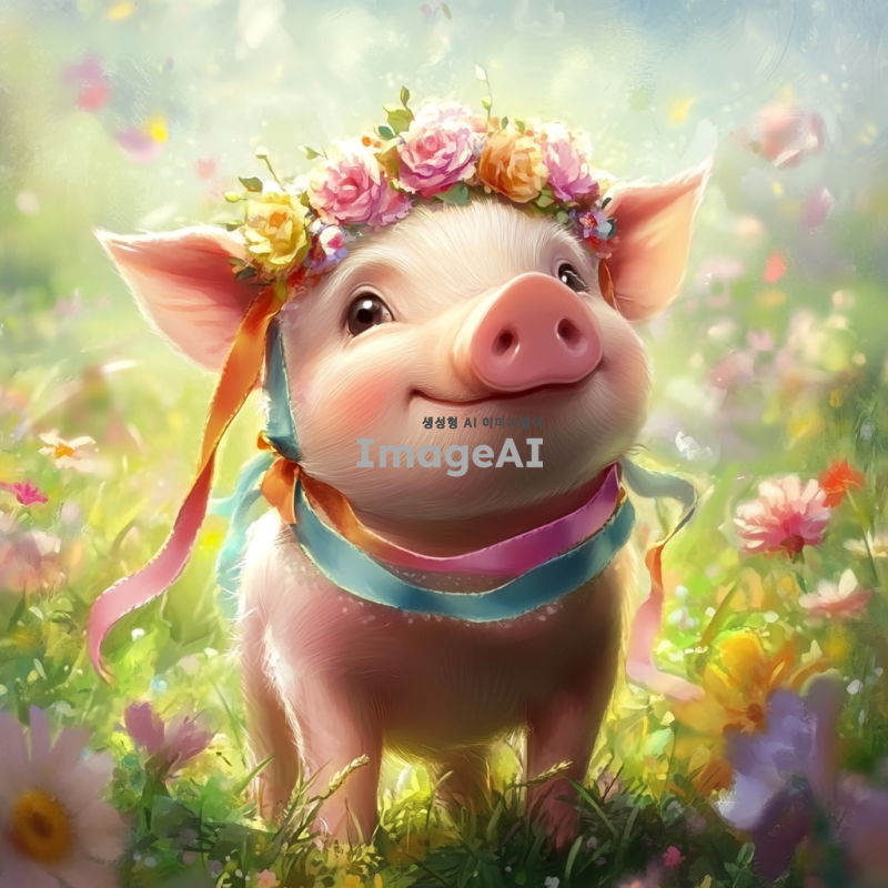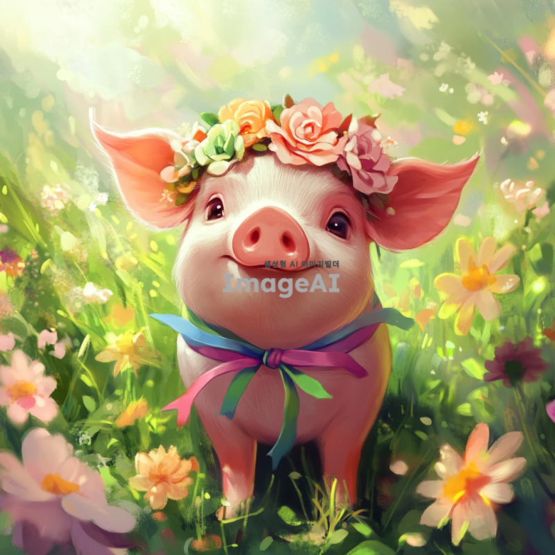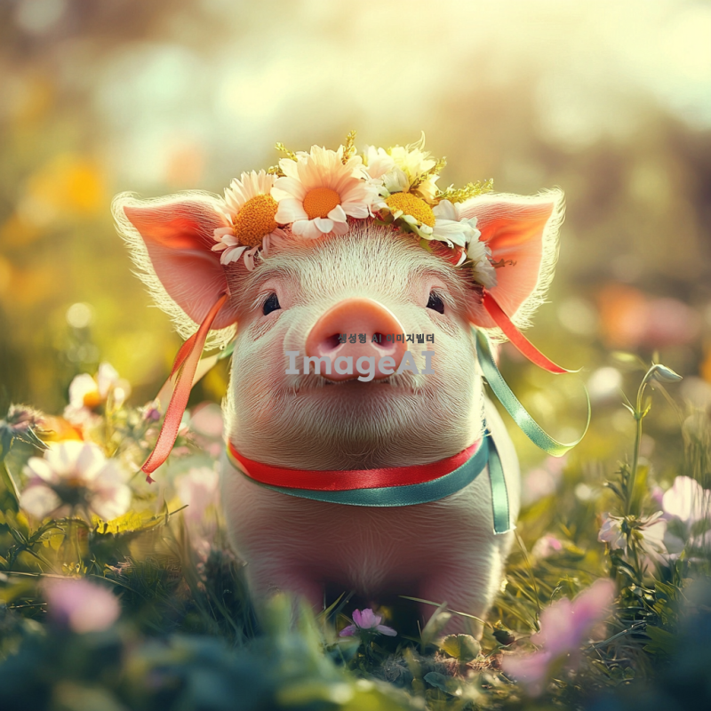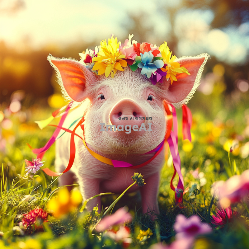 리본을 두른 귀여운 돼지, 화사한 색상의 리본이 돼지의 머리와 몸에 장식되어 있는 모습, 사랑스럽고 아기자기한 분위기, 배경은 푸른 초원과 꽃들이 만발한 풍경, 따뜻한 햇살이 비추는 밝고 행복한 느낌의 이미지.