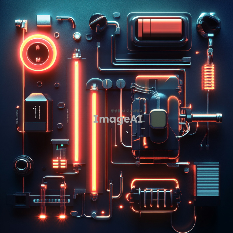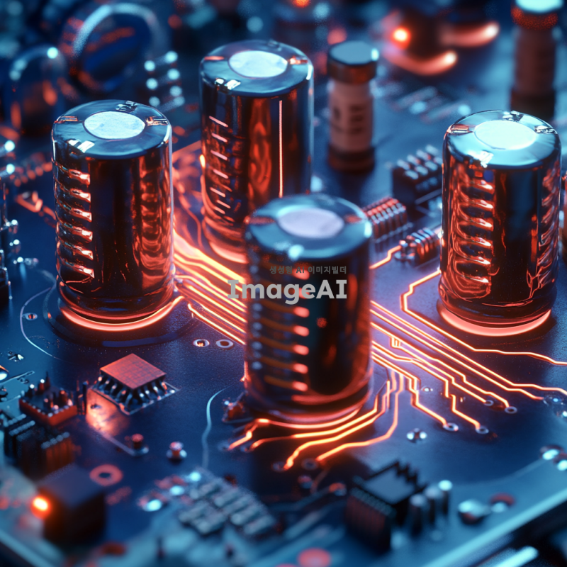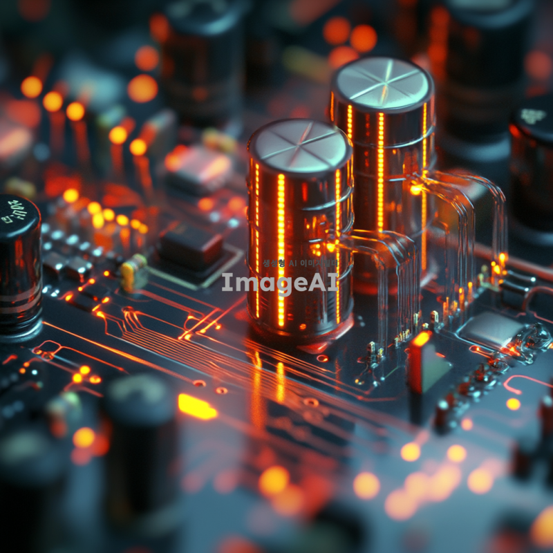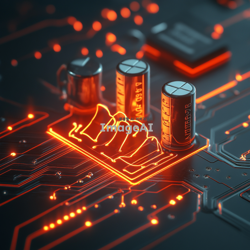 전기 회로의 간단한 구성 요소들이 연결된 모습을 보여주는 이미지, 저항, 커패시터, 인덕터가 포함된 회로 구조, 현대적인 디자인으로 세밀하게 표현, 전기 흐름을 시각적으로 나타내는 빛나는 효과 추가.