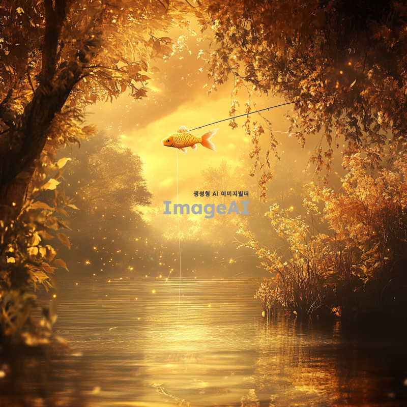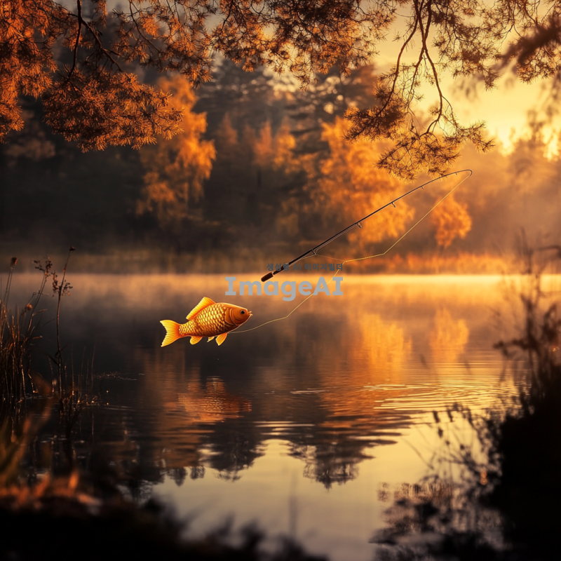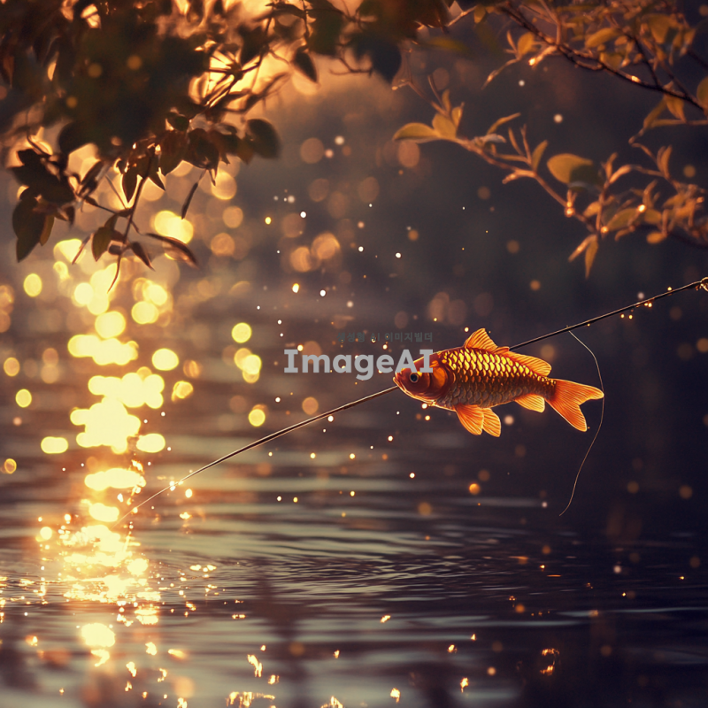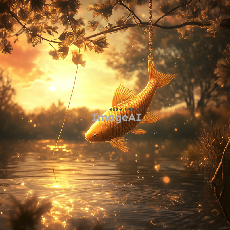 고요한 반짝이는 호숫가에 황금색 낚시대가 세워져 있고, 그 위에 황금색 잉어가 걸린 모습. 호숫가는 마법의 빛으로 환상적으로 휩싸여 있으며, 주변에는 신비로운 분위기가 감돌고 있다. 호수의 물결은 부드럽게 일렁이고, 하늘은 저녁 노을로 물들어 있다. 자연의 아름다움과 마법의 조화가 어우러진 장면.