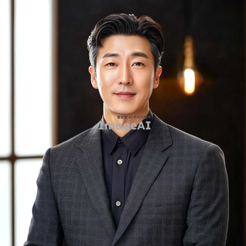 양복을 입고 부드러운 미소를 지닌 한국인 회장님 스타일의 인물, 고급스러운 사무실 배경, 따뜻한 조명, 자신감 있는 자세, 세련된 헤어스타일, 비즈니스 분위기, 전문적인 느낌