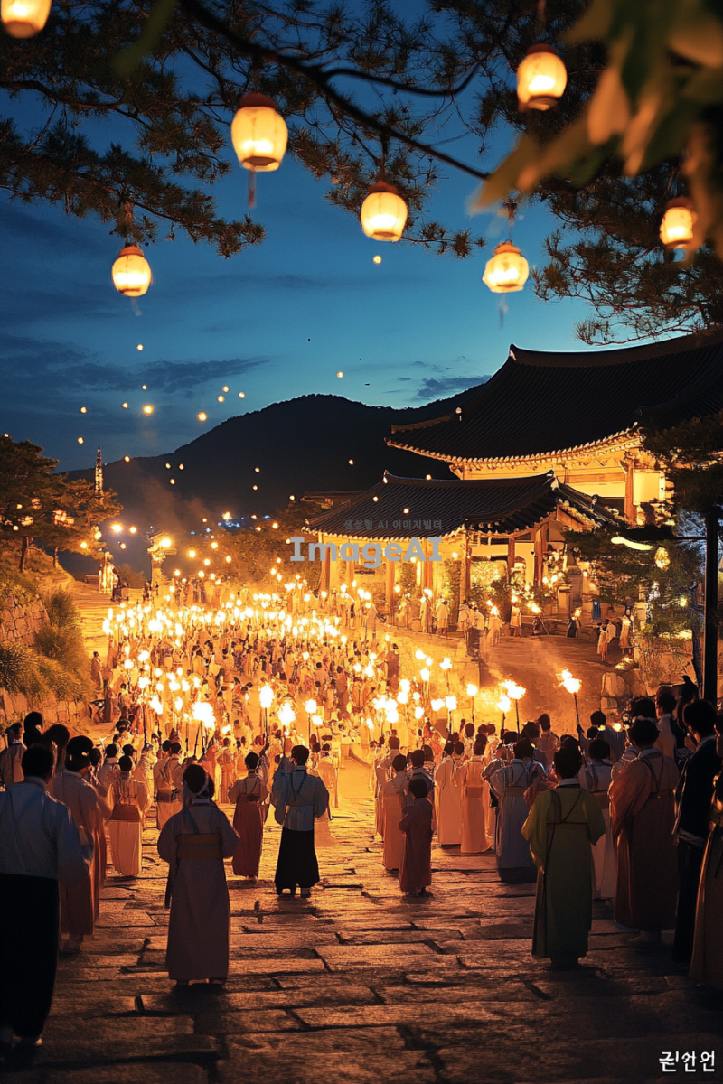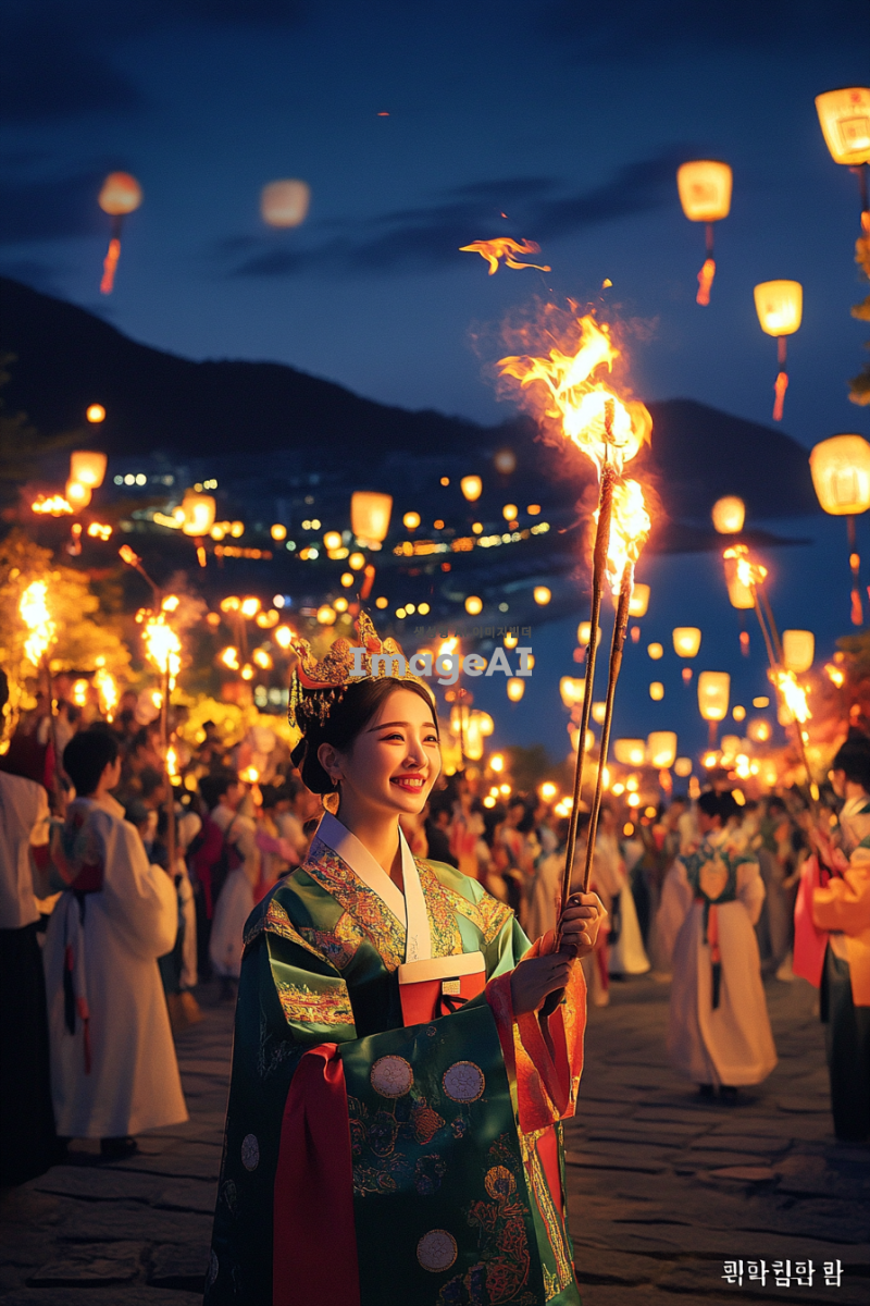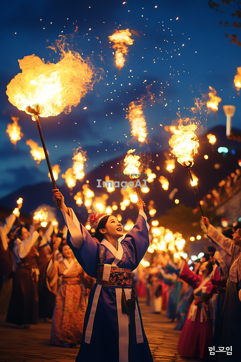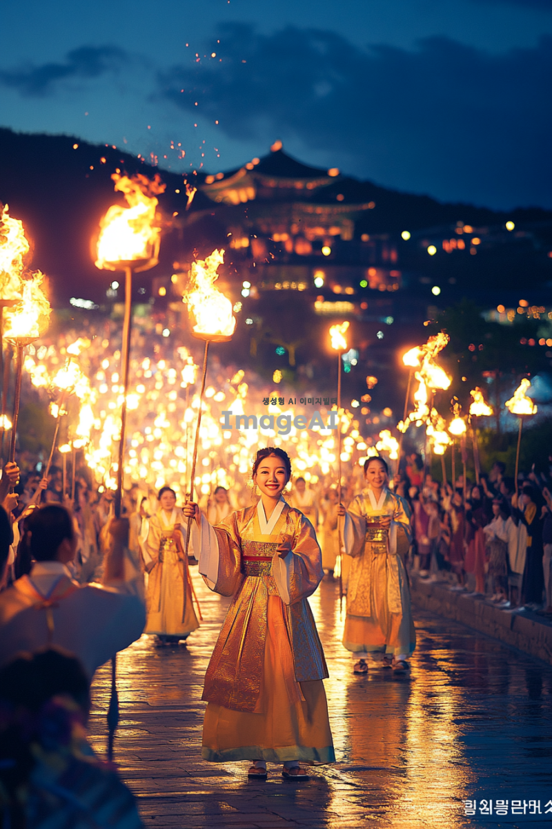 현대적 감각의 빛과 미디어 요소가 가미된 제주에서의 횃불 대행진 민속놀이, 한국인들이 전통 의상을 입고 밝은 표정으로 참여하고 있는 모습, 배경에는 제주의 아름다운 자연경관과 현대적인 건축물이 어우러져 있는 장면, 화려한 횃불의 불빛이 어두운 밤하늘을 밝히며 축제의 분위기를 한층 고조시키는 모습