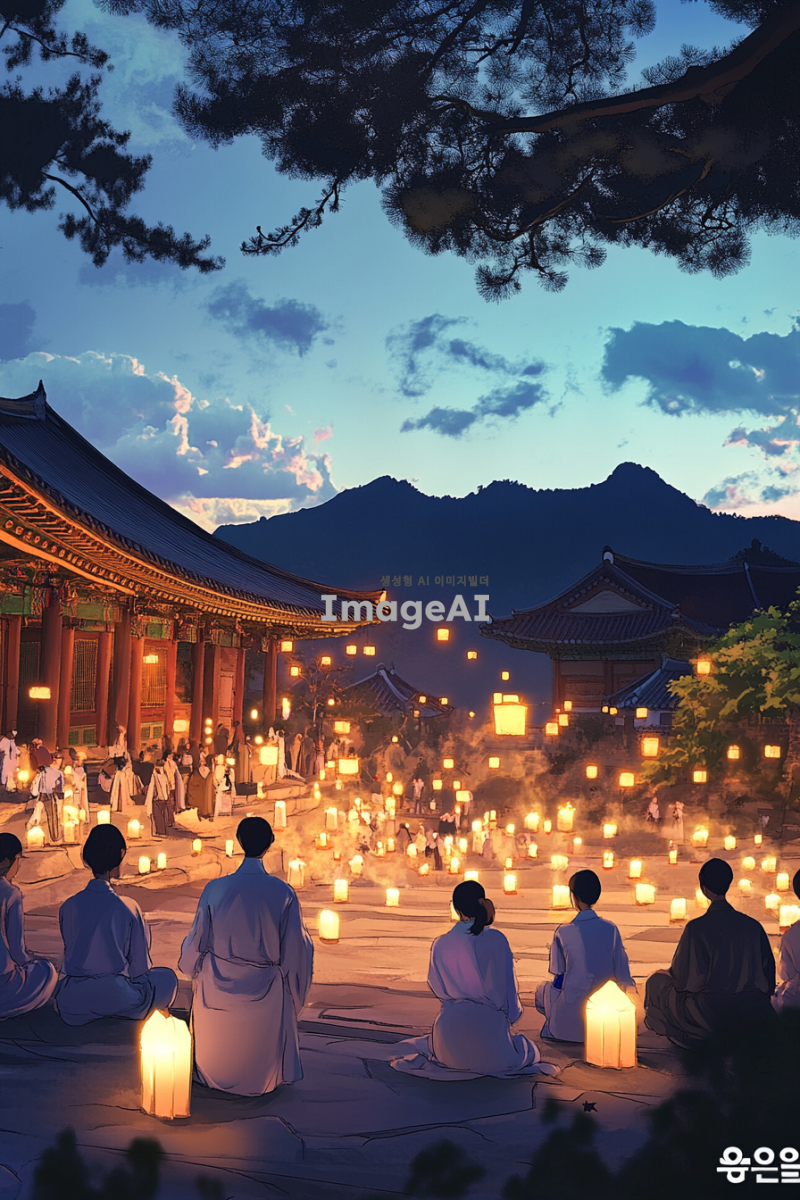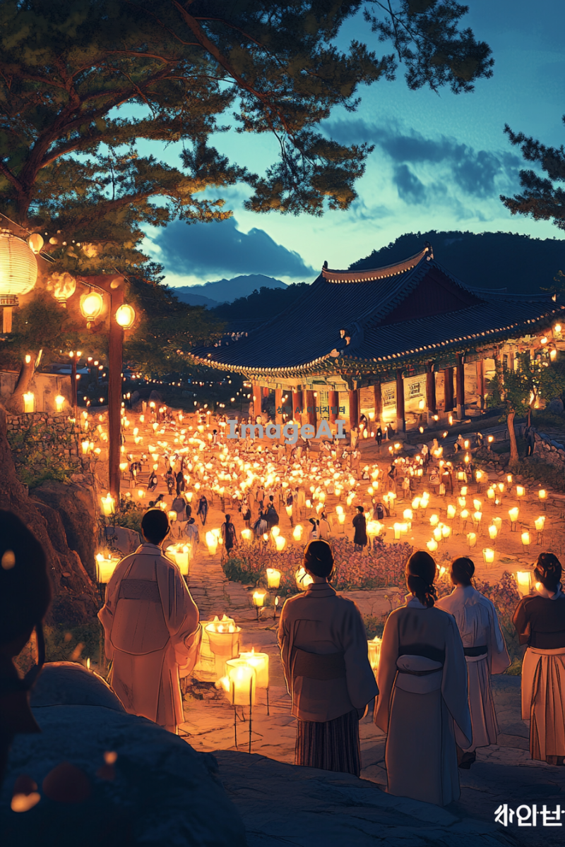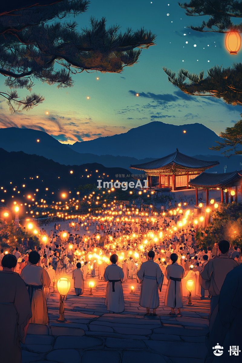 제주도의 아름다운 풍경을 배경으로 현대적인 감각이 느껴지는 민속놀이를 즐기는 캐릭터들이 있는 장면. 5명 이내의 캐릭터가 등장하며, 그 중 일부는 촛불을 들고 있다. 캐릭터들은 뒷모습이나 측면에서 표현되며, 화려한 색감과 빛의 효과가 강조되어 현대적인 느낌을 준다. 민속놀이의 전통적인 요소와 함께 제주도의 독특한 자연 경관이 조화롭게 어우러진 일러스트.
