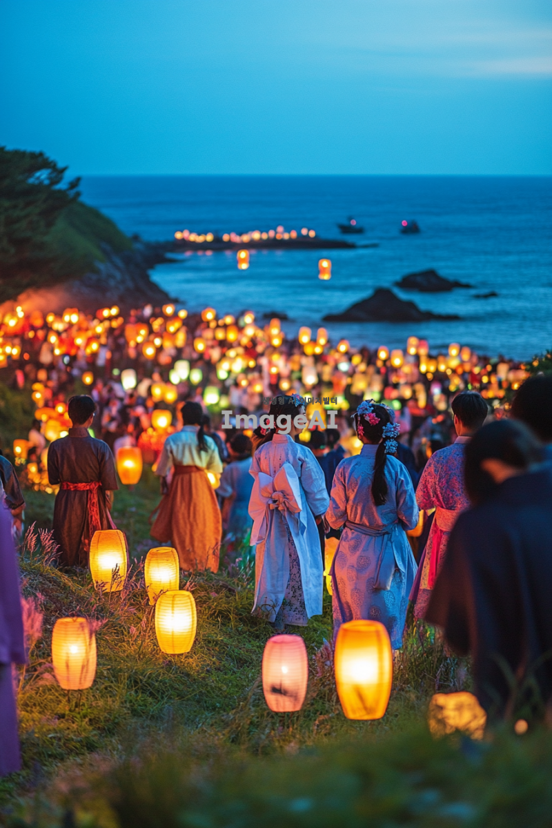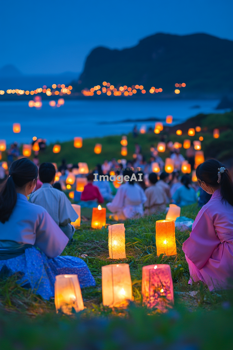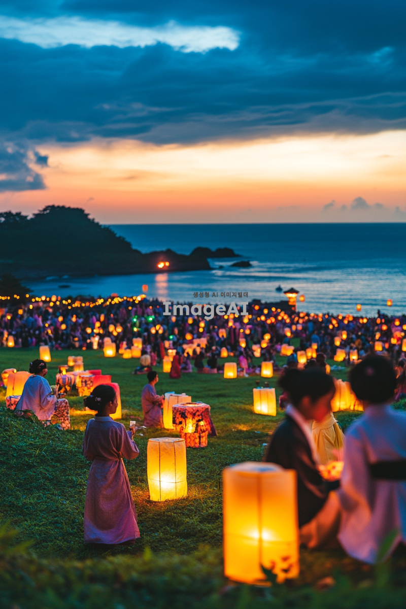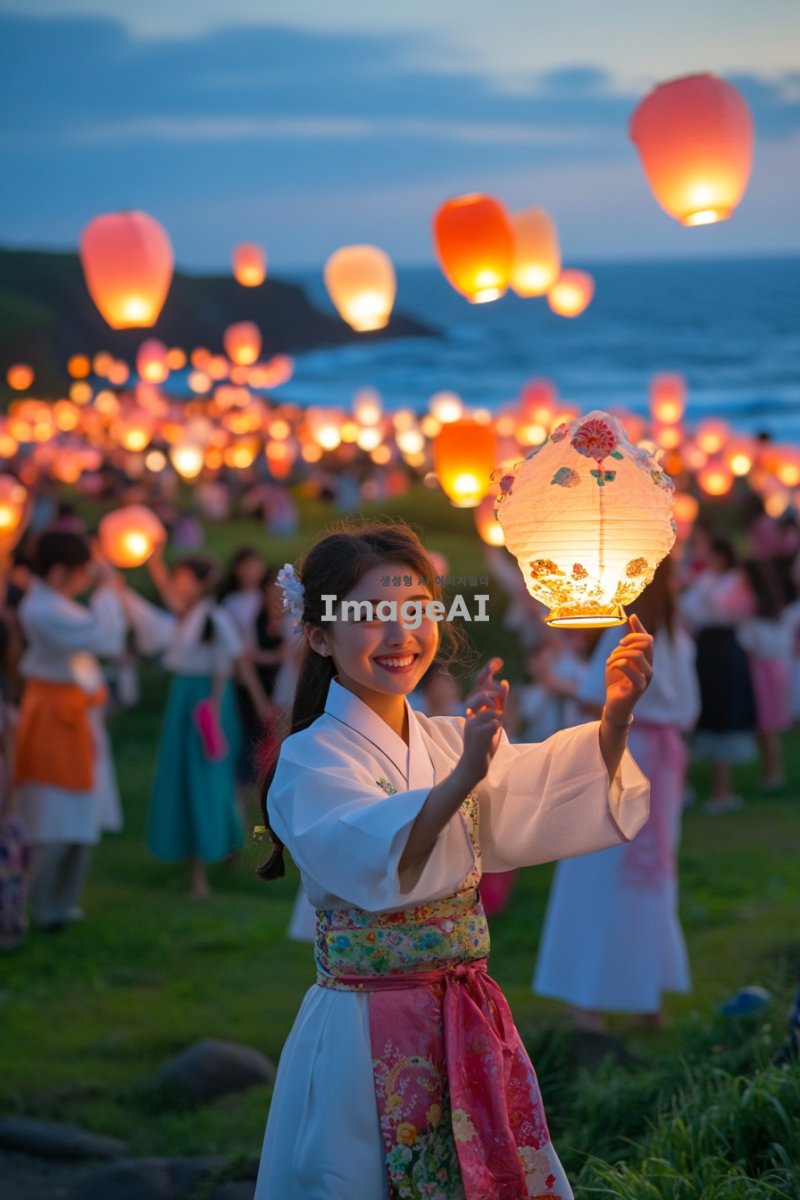 제주의 푸른 바다와 푸른 풀밭 위에서 등불놀이와 민속놀이를 즐기는 사람들, 화려한 등불이 밤하늘을 밝히고, 전통 의상을 입은 사람들이 웃으며 놀이에 참여하는 모습, 배경에는 제주 특유의 자연경관과 바다가 펼쳐져 있는 장면.