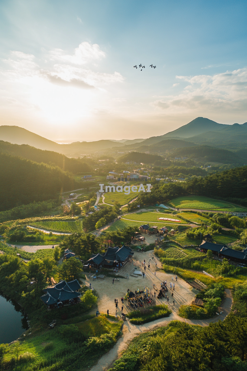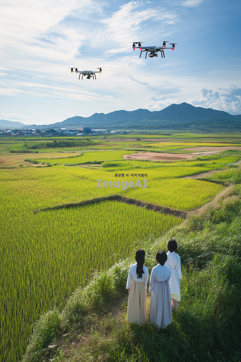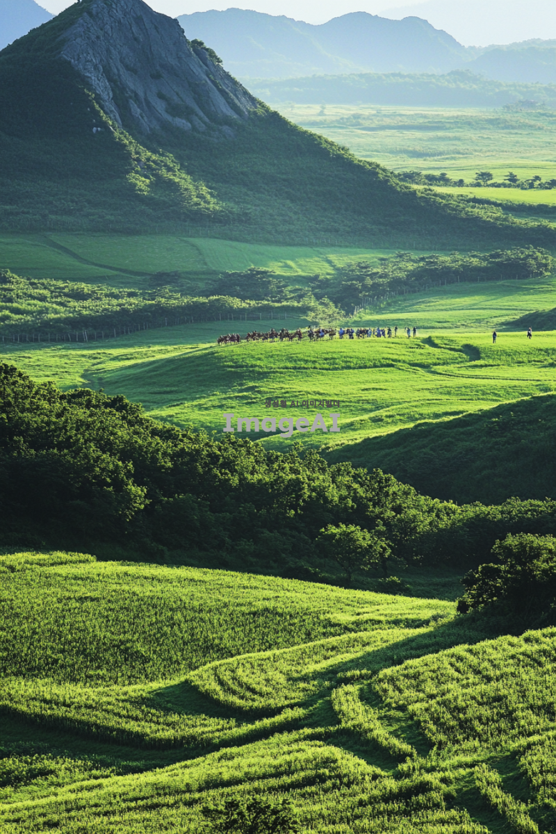 제주도의 푸른 넓은 들판에서 화려한 드론쇼가 펼쳐지는 축제 분위기, 빛을 내 불꽃놀이처럼 아름다운 경관을 보인다, 전통 민속놀이를 즐기는 현대 한국 사람들, 한복 입은 사람 말고 현대의 사람들, 푸른 하늘과 함께 어우러진 풍경, 제주도의 아름다운 자연과 함께하는 즐거운 순간.