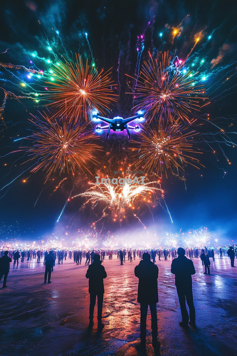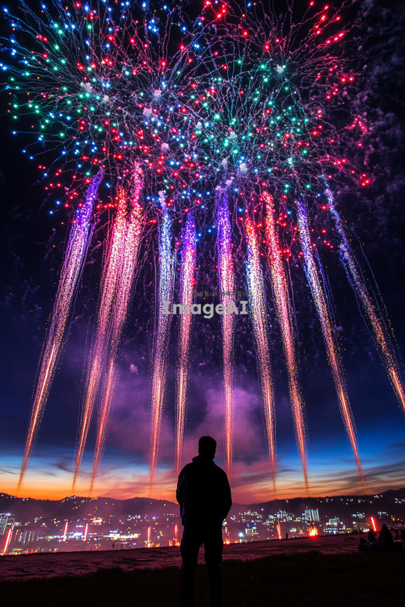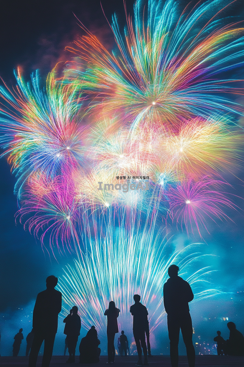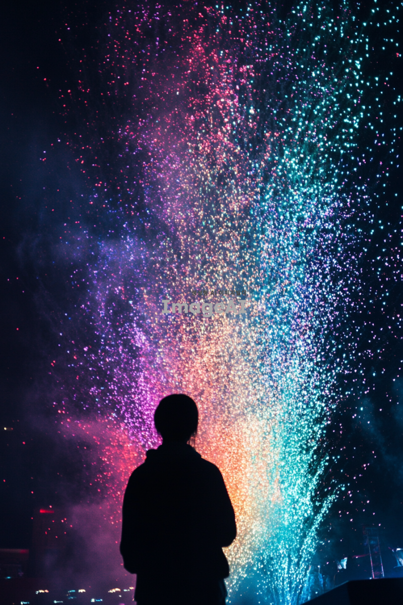 현대적인 불꽃놀이 드론쇼가 펼쳐지는 제주도 축제의 밤, 고요한 어둠 속에서 화려한 드론들이 형형색색의 불꽃을 만들어내며 하늘을 수놓고 있는 모습. 옛날 풍경이 아닌 현대적인 요소로 가득한 축제 분위기, 사람들은 보이지 않지만 뒷모습의 그림자들이 드론쇼를 감상하고 있는 듯한 느낌을 주는 장면. 밤하늘의 감성적인 분위기를 강조하며, 불꽃놀이의 경관이 돋보이는 신비로운 풍경.